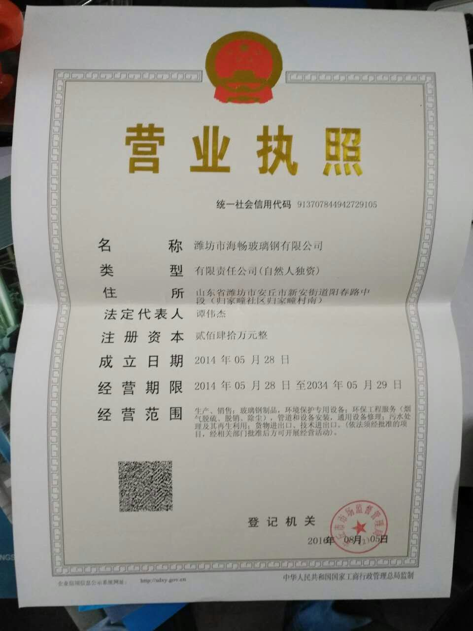 濰坊市海暢玻璃鋼有限公司,坐落山東濰坊安丘,成立于2005年,前身安丘金運玻璃鋼廠。主營,玻璃鋼儲罐,管道,脫硫塔,冷卻塔,濕電除塵,各種玻璃鋼制品,公司擁有先進數控纏繞設備,專業技術人員十三人。