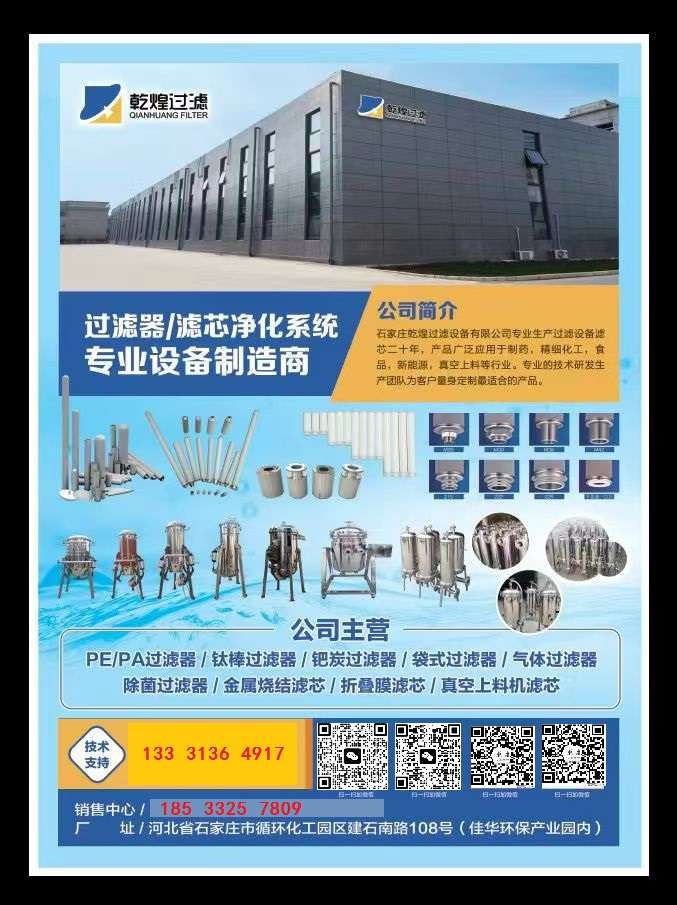 石家莊乾煌過濾設備有限公司是國內較早從事簡式過濾機、微孔過濾機、管式過濾機的技術研制、生產和應用的高科技企業。自產的鈦棒微孔燒結濾芯、PE/PA高分子燒結濾芯、不銹鋼粉末燒結濾芯、不銹鋼纖維燒結折疊濾芯、微孔膜折疊濾芯均與本公司的筒式過濾機配套,組合成完整的過濾、分離、凈化系統。產品質量符合規范要求,廣泛應用于制藥、精細化工、石油化工、食品飲料、大型水處理、污水處理、電子、化纖等行業。 公司致力于過濾設備、過濾器材、分離產品的研究開發、產業化制造、工程化應用以及市場推廣。公司秉承“創造一流產品,追求卓越服務”的經營理念,以“務實、創新、高效、誠信”的企業精神贏得了廣大用戶的好評。 乾煌公司堅持以客戶為導向,時刻關注來自于市場、來自于用戶的多方面需求與意見,不斷改進技術,完善服務,提高品質。公司強大的售后服務體系可以為用戶提供快捷、專業、熱情的技術與服務、我們會以一流的產品和優質的服務為您解決設備工藝上的需求和難題,為您量身定做符合您要求的工藝和設備。