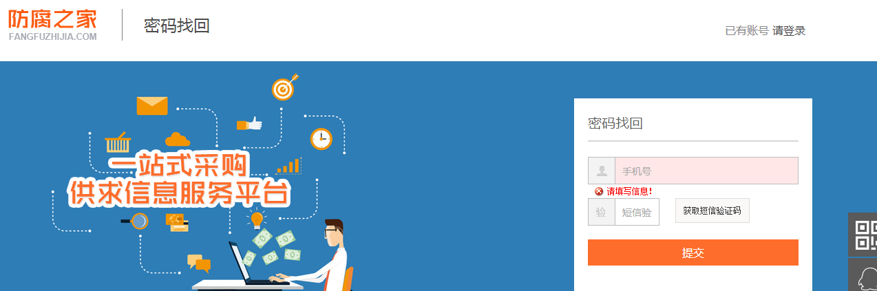 1.在“防腐之家”首頁右側(cè)部分,點擊【找回密碼】,進入密碼找回界面。