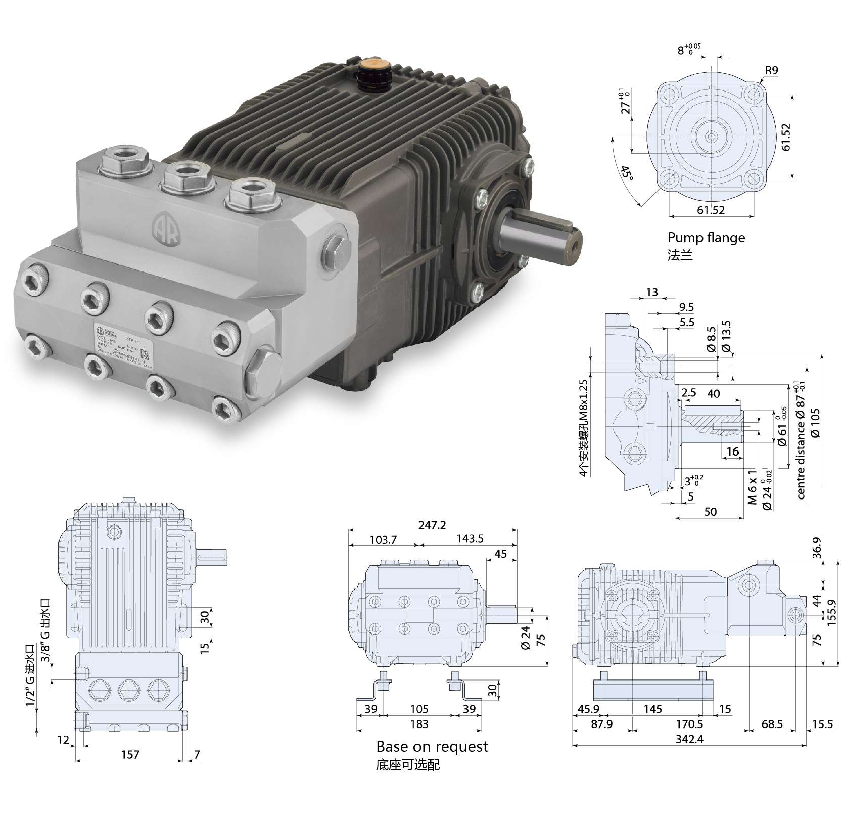 大尺寸曲軸連桿結構 可根據(jù)大流量需求用于固定或可移動的高壓清洗機 例如馬路清洗車 環(huán)境清掃車等 這是一款全新設計的水泵 在低速情況下每分鐘流量可以達到 升以上 并有好的性能和更長的使用壽命 這款水泵采用傳統(tǒng)設計 配有高強度鋼材制的曲軸 依靠兩個大錐形滾軸支撐 連桿采用特制的低摩擦合金制成 泵體和罩體...