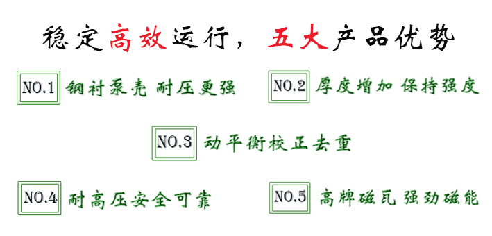 驅(qū)動裝置采用主動磁鐵聯(lián)軸器直接裝在電機軸上,泵室封閉,通過磁力偶合間接驅(qū)動泵軸上帶磁鐵的葉輪旋轉(zhuǎn)結(jié)構(gòu)緊湊、安全節(jié)能。