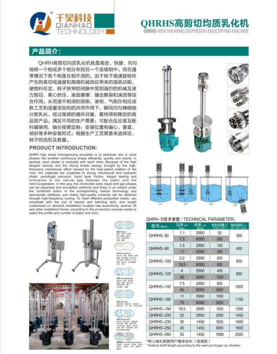 QHPH系列高剪切分散乳化機(jī)就是高效、快捷、均勻地將一個(gè)相或多個(gè)相分布到另一個(gè)連續(xù)相中。而在通常情況下各個(gè)相是不相溶的。由于轉(zhuǎn)子高速旋轉(zhuǎn)所產(chǎn)生的高切線速度和高頻機(jī)械效應(yīng)帶來(lái)的強(qiáng)勁動(dòng)能,使物料在定、轉(zhuǎn)子狹窄的間隙中受到強(qiáng)烈的機(jī)械及液力剪切、離心擠壓、液層摩擦、撞擊撕裂和湍流等綜合作用。從而使不相溶的固相、液相、氣相在相應(yīng)成熟工藝和適量添加劑的共同作用下,瞬間均勻精細(xì)地分散乳化,經(jīng)過(guò)高頻的循環(huán)往復(fù),終得到穩(wěn)定的高品質(zhì)產(chǎn)品。