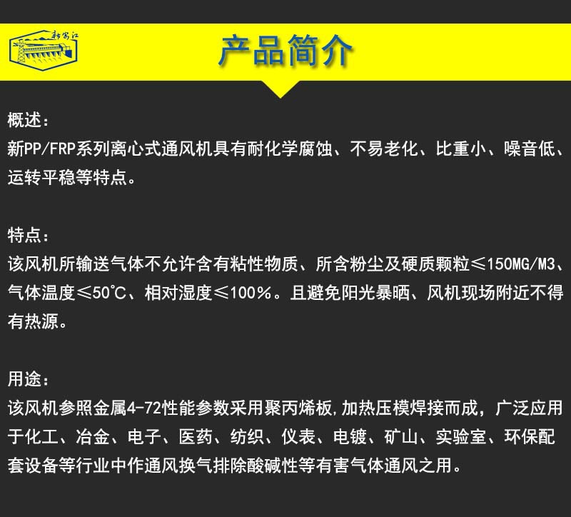 概述:新PP/RPP系列離心式通風機具有耐化學腐蝕、不易老化、比重小、噪音低、運轉平穩等特點。特點:該風機所輸送氣體不允許含有粘性物質、所含粉塵及硬質顆粒≤150mg/m3、氣體溫度≤50℃、相對濕度≤100%。且避免陽光暴曬、風機現場附近不得有熱源。用途:該風機參照金屬4-72性能參數采用聚丙烯板,加熱壓模焊接而成,廣泛應用于化工、冶金、電子、醫藥、紡織、儀表、電鍍、礦山、實驗室、環保配套設備等行業中作通風換氣排除酸堿性等有害氣體通風之用。