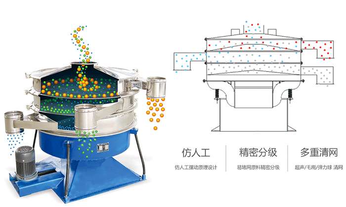 搖擺篩是一種仿人工搖動的低頻旋振篩,其原理是:瞬時運動為沿徑向的位移和以此位移為軸的圓周運動的合成(螺旋運動)。即可調節偏心距的激振器產生了非線性三維運動,物料也產生同樣的近似手動作業的運動,從而達到篩分之目的,再配合篩分附件可得到更加理想的篩分效果;適合于圓球狀、圓柱狀、片狀、乃至不規則形狀易堵網且需要精密篩分的物料?;镜幕剞D運動與人工篩分相類似。偏心率從25到40mm可調,低速V型皮帶驅動從120到360rpm可調,每一種產品的停留時間可以通過搖擺篩的徑向與切角朝驅動軸線方向進行調整。因此建立水平與拋擲三維翻滾運動。物料從中心到外緣在整個篩面上均勻分散,從而以螺旋運動往軸向傳播。細小顆粒從而完成了整個篩分過程。水平與垂直加速度隨著粒子的運動而增加,接近篩孔尺寸的顆粒隨之成功分離;較大顆粒被運到出口處,出口處由一個可調節的導向裝置控制流量,該導向裝置是控制物料停留時間的另一個因素。此次過程在每篩層之間重復進行。