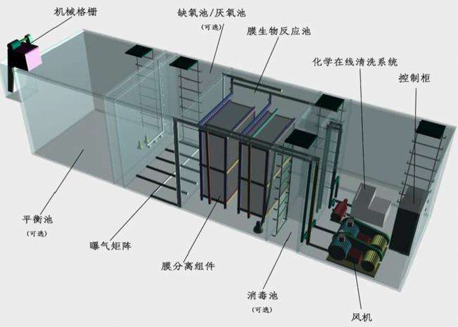 一體化中水回用設備采用膜生物反應器(Membrane Bioreactor,簡稱MBR〕技術是生物處理技術與膜分離技術相結合的一種新工藝,取代了傳統工藝中的二沉池,它可以高效地進行固液分離,得到直接使用的穩定中水。又可在生物池內維持高濃度的微生物量,工藝剩余污泥少,極有效地去除氨氮,出水懸浮物和濁度接近于零,出水中細菌和病毒被大幅度去除,能耗低,占地面積小。70年代在美國、日本、南非和歐洲許多國家就已開始將膜生物反應器用于污水和廢水處理的研究工作。截至2012年日本有1000余座MBR在運轉。其水源取自生活污水(如淋浴排水、盥洗排水、洗衣排水、廚房排水、廁所排水等〕和冷卻水。