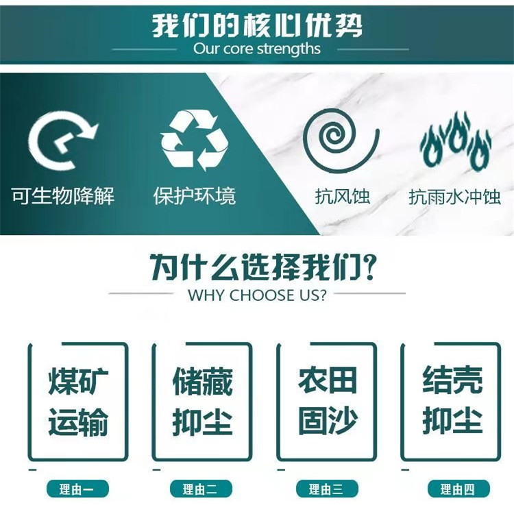 可廣泛應用于煤炭及各類金屬、非金屬采礦區、礦物粉渣堆料場、煤炭及礦粉運輸、礦物土方儲存卸載場、建筑物拆除、在建道路沿線、火電廠、水泥廠、鋼鐵廠、冶金廠、粉塵車間、人工沙灘和沙漠化地區等場所。