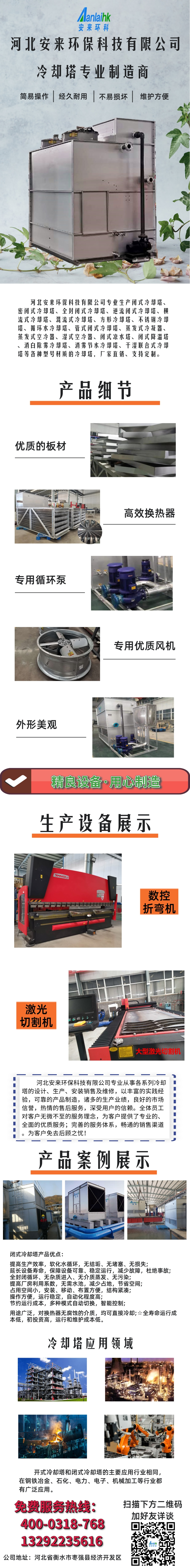 冷卻塔為使盤管中的熱水迅速降溫,利用風機產生流動空氣加快傳熱,噴淋水與盤管發生熱交換,又攜帶走大量的熱能。攜熱噴淋水與空氣產生二次熱交換,流動的空氣又擴大了水氣交換的效果。閉式冷卻塔中的閉式系統循環水水質穩定,能確保被冷卻設備的設計使用壽命,并確保較高的系統效率,不會出現設備被污物堵塞現象,長期運行穩定、可靠。維護費用低,可大量減少維護費用及時間;同時也杜絕了風沙等對循環水系統的污染。
