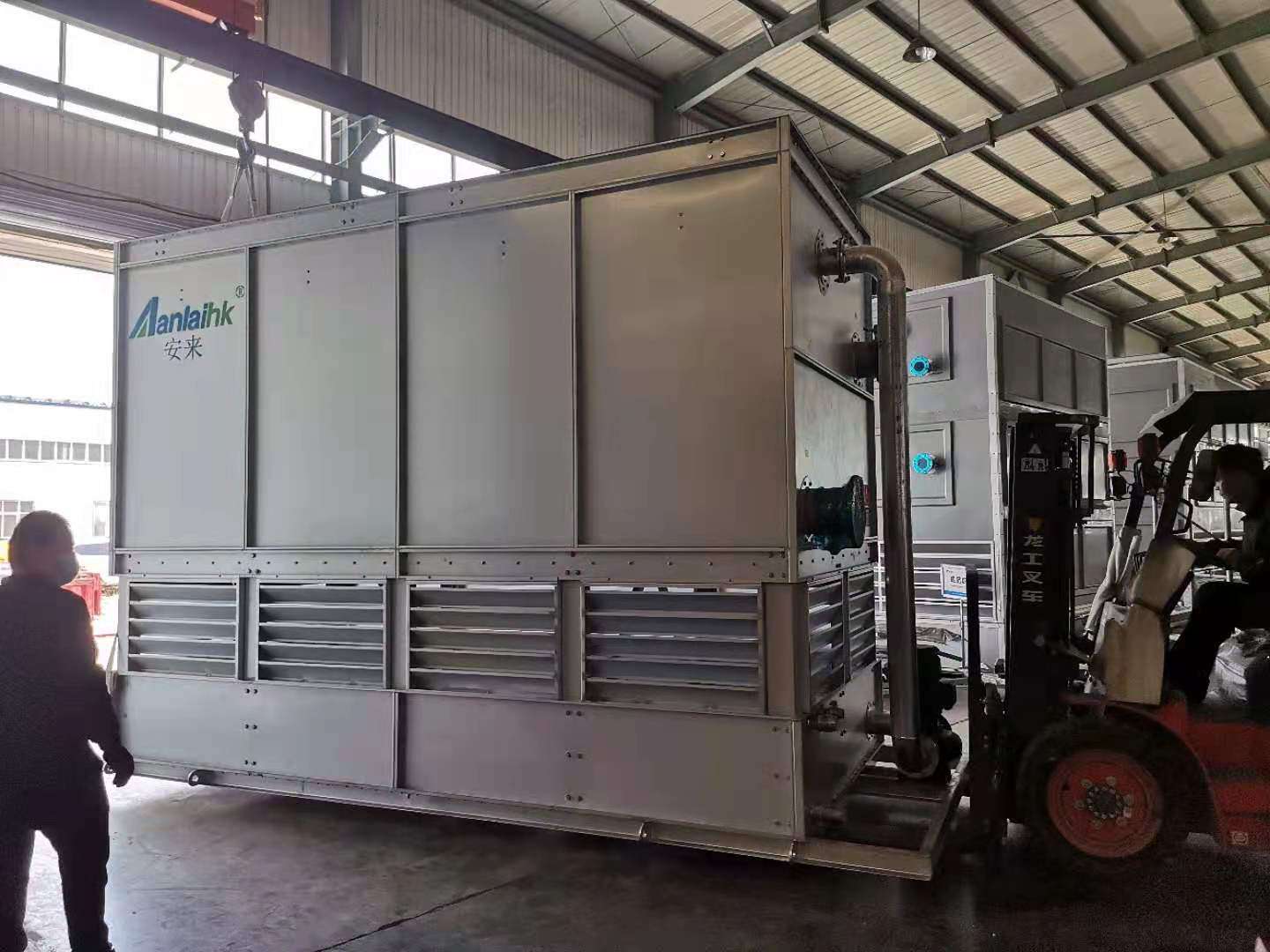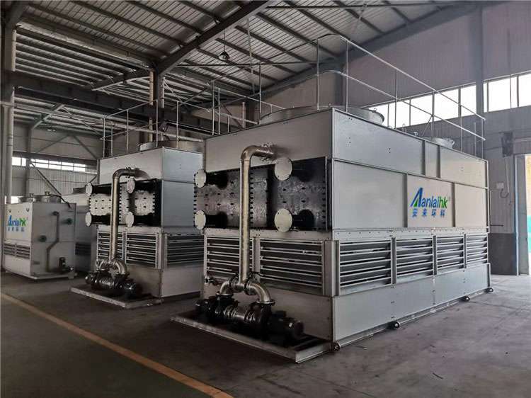 1、閉式冷卻塔實際上是一種蒸發式冷卻塔,冷卻器和濕式冷卻塔的組合,它是臥式的蒸發式冷卻塔,工藝流體在管內流過,空氣在管外流過,兩者互不接觸。閉式冷卻塔是傳統冷卻塔的一種變形和發展。塔底蓄水池內的水由循環泵抽取后,送往管外均勻地噴淋下來。與工藝式流體熱水或制冷劑和管外空氣并不接觸,成為一種閉式冷卻塔,通過噴淋水增強傳熱傳質的效果。