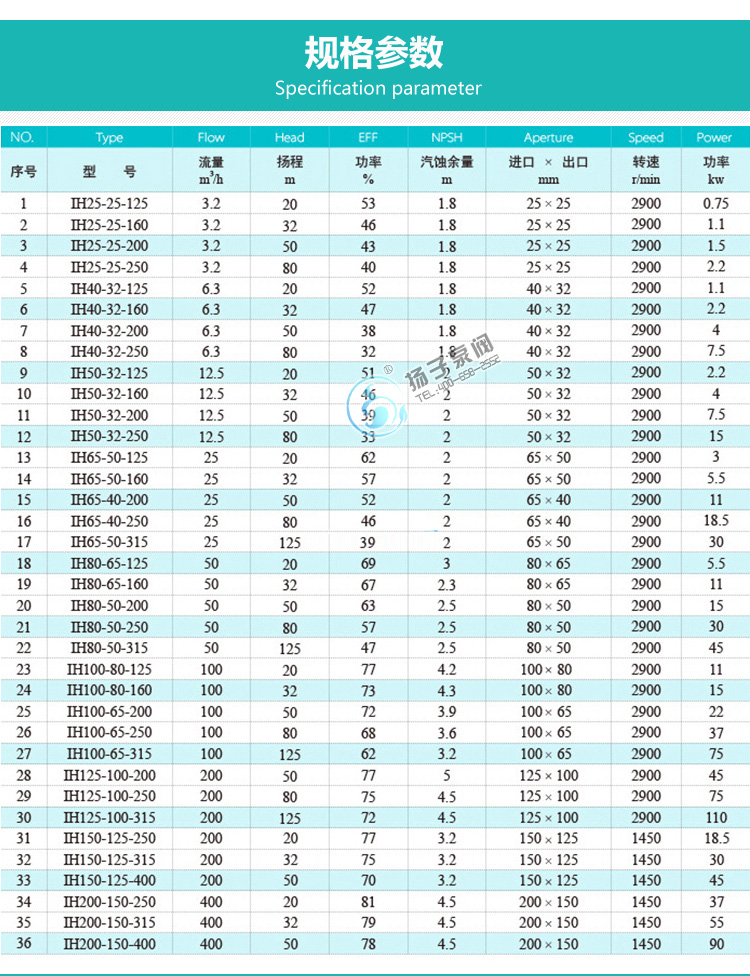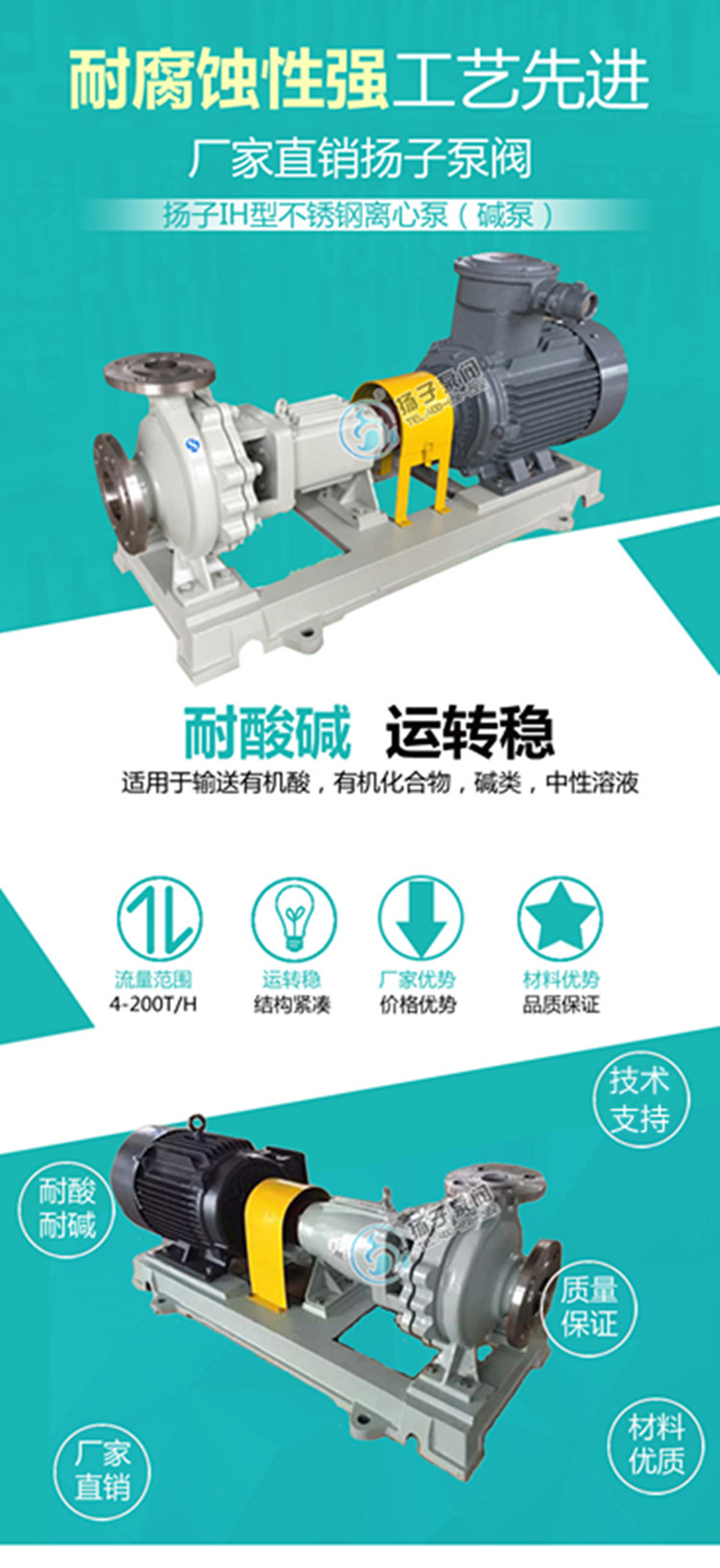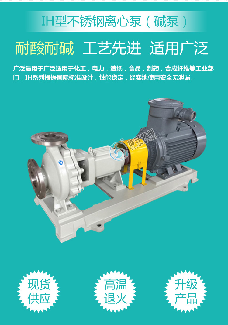IH型不銹鋼離心泵輸送介質溫度為-20℃~120℃,需要時采用雙端面密封冷卻裝置,可輸送介質溫度為-20℃~+280℃;該不銹鋼離心泵適用于化工、石油、冶金、電力、造紙、食品、制藥、環保、廢水處理和合成纖維等行業用于輸送各種腐蝕 的或不允許污染的類似于水的介質;IH不銹鋼離心泵適用于化工、石油、冶金、輕工、印染、造紙、制藥、食品、釀酒、環保、海水淡水、海上采油等工業部門,供輸送溫度為-20。C105的腐蝕性介質或物理化學性能類似于水的液體。