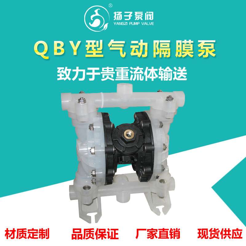 QBY型氣動動隔膜泵是一種新型輸送機械,是目前國內較新穎的一種泵類。采用壓縮空氣為動力源,對于各種腐蝕性液體,均能予以抽光吸盡。其性能參數與聯邦德國的WLLDENPVMPS、美國的MARIOWPUMPS相近,已被國內近一千多家石油、化工、電子、陶瓷、紡織系統單位采用,安置在各種特殊場合,用來抽送各種常規泵不能抽吸的介質,均取得了滿意的效果,也可根據用戶要求,分為鑄鐵、不銹鋼、鋁合金、工程塑料;QBY氣動隔膜泵不需灌引水, 流動寬蔽,允許通過既能抽送流動的液體,又能輸送一些不易流動的介質,具有自吸泵、潛水泵、屏蔽泵、泥漿泵和雜質泵等許多優點;可以浸沒在介質中工作,本泵無須用油潤滑,即使空轉,對泵也基本無影響。揚程、流量可通過氣閥開度實現無級調節。標準吸程高達7m,揚程達70m,出口壓力≥6kgf/c㎡。