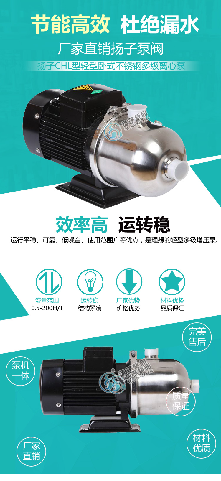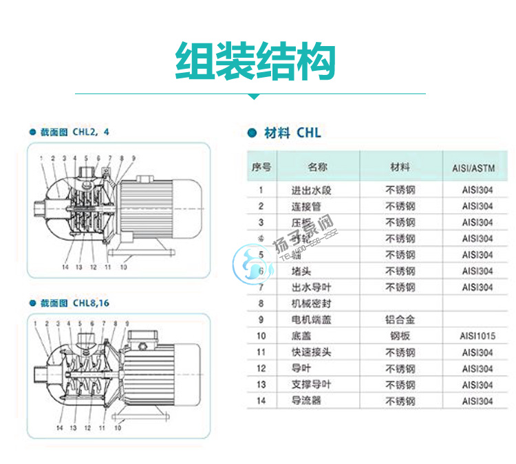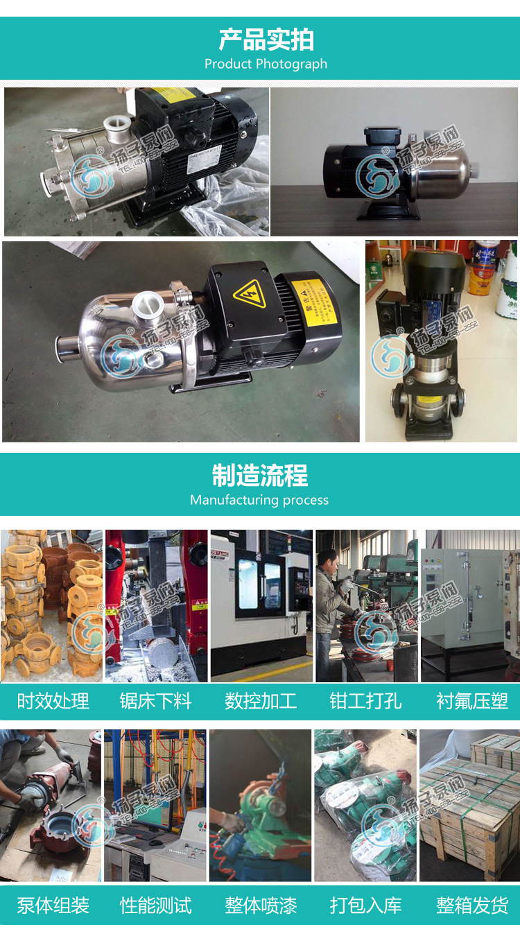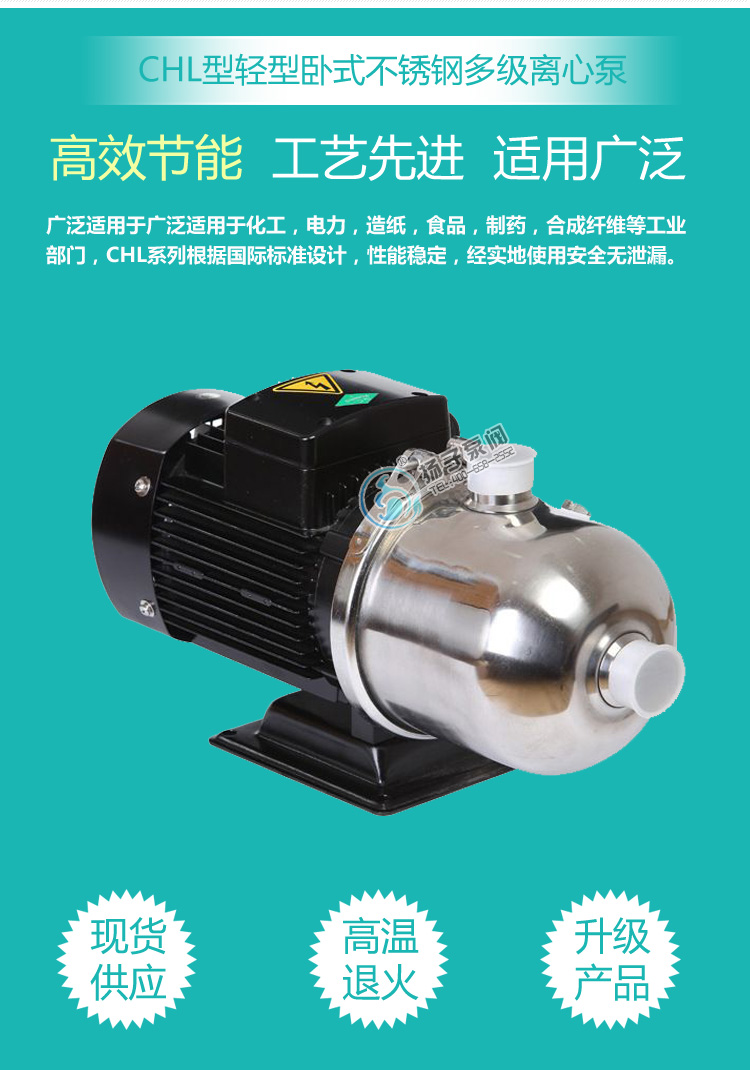 CHL、CHLF型輕型臥式多級離心泵采用了免修機械密封,該多級泵的過流部件均采用不銹鋼材料(304或316)制成,具有低噪音,耐輕腐蝕,外形美觀、體積小、重量輕、使用壽命長等特點;CHL、CHLF型多級離心泵主要用于家庭型中央空調循環及工業上液體的傳輸,如:脫礦物質水、軟水、凈化系統、輕油等的循環和增壓:型中央空調、循環冷卻系統、工業清洗、水處理(水的凈化)、水產養殖、施肥/計量系統、環境應用。