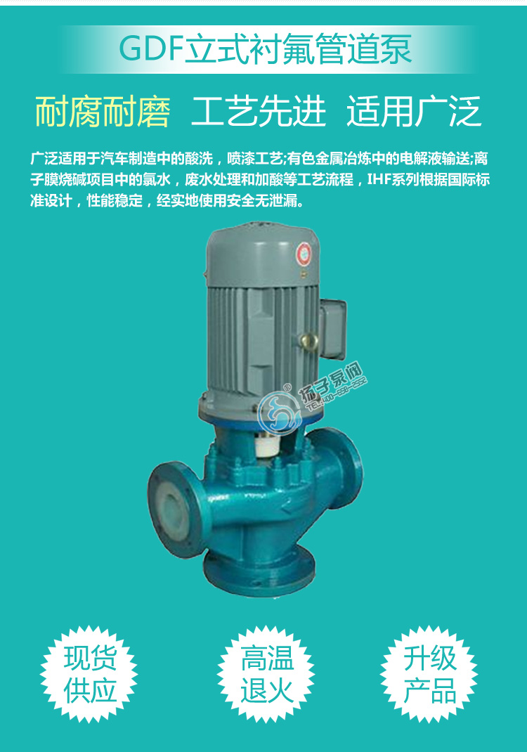 GDF型立式襯氟管道泵是揚子泵閥結合市場需求,參照guoji標準及相關標準設計制造,過流部件為氟塑料(F46),自主研發襯里工藝,耐腐蝕性范圍廣,強度高,經久耐用。本產品廣泛適用于:酸洗工藝、噴漆工藝、有色金屬冶煉中的電解液輸送、離子膜燒堿項目中的氯水、廢水處理和加酸等工藝流程;適用溫度為:-20℃—150℃。