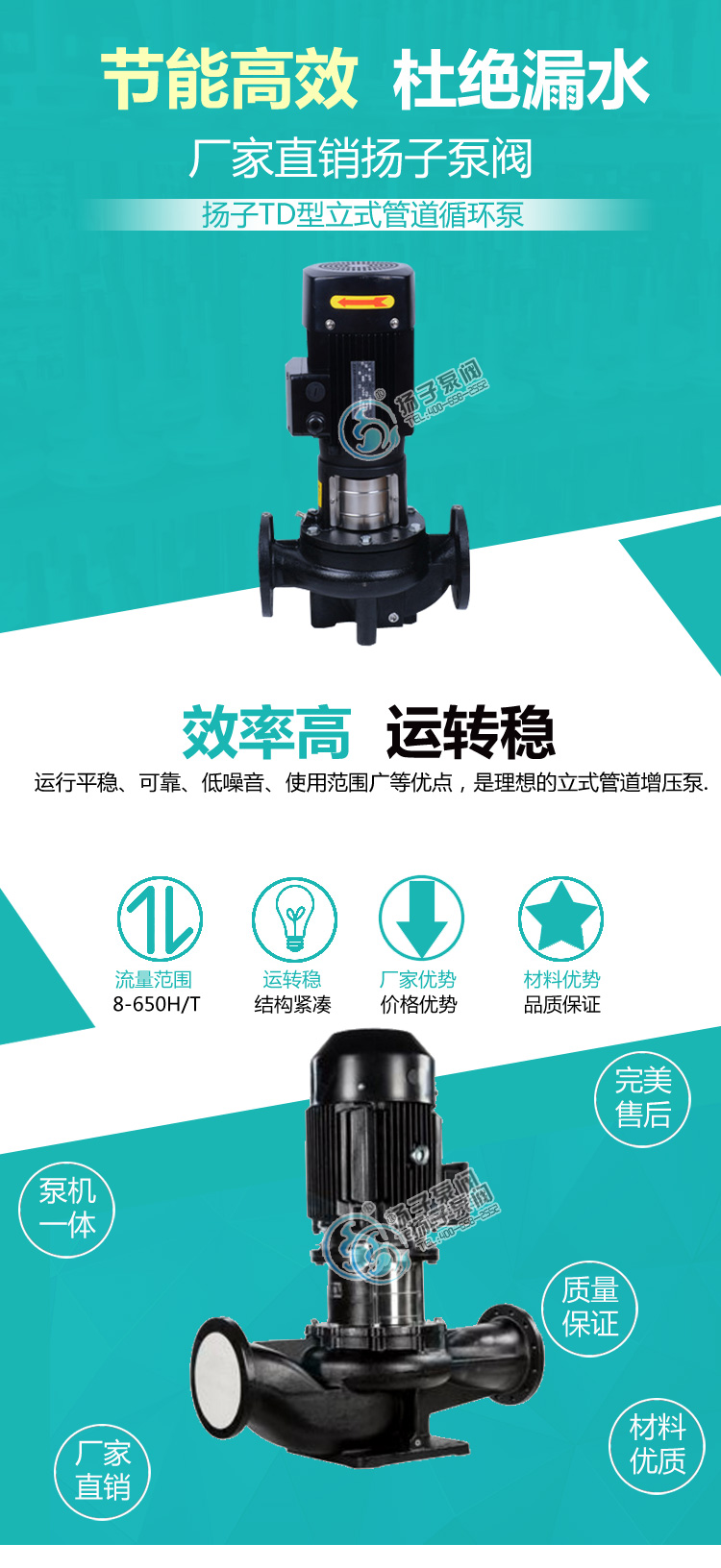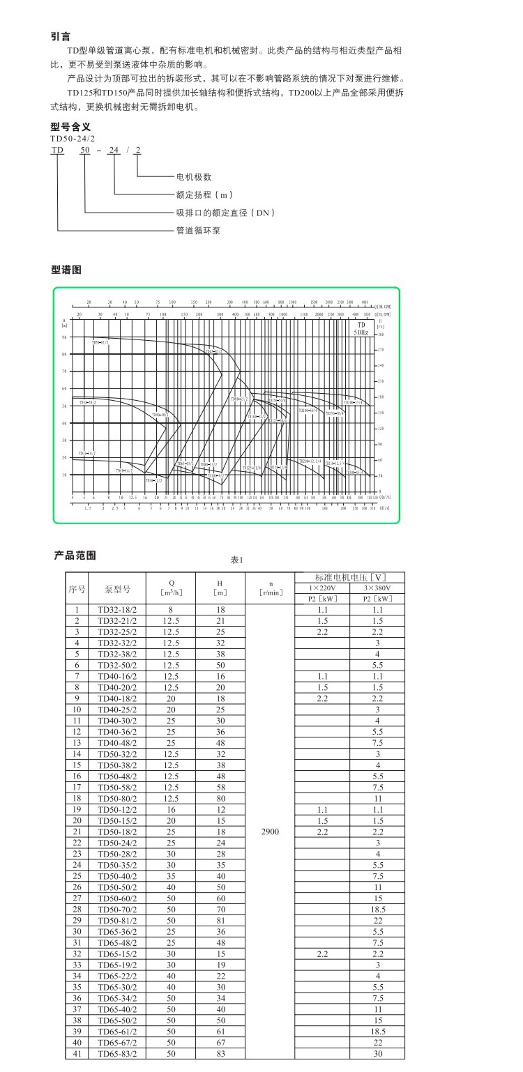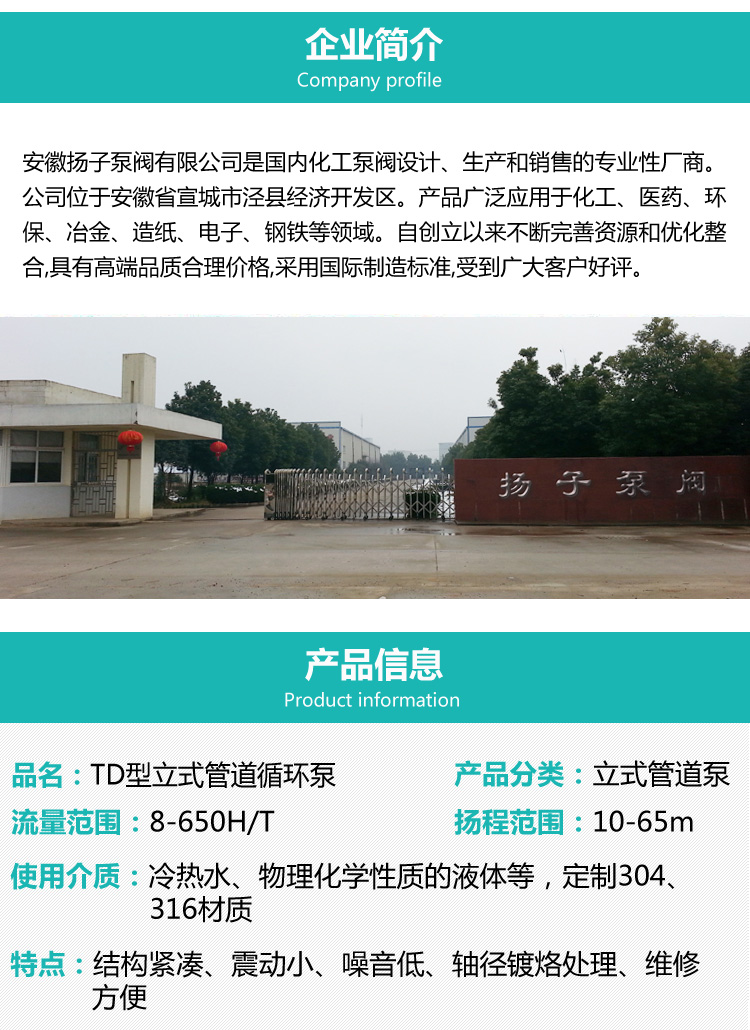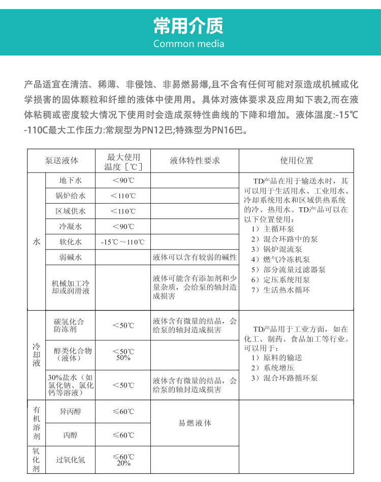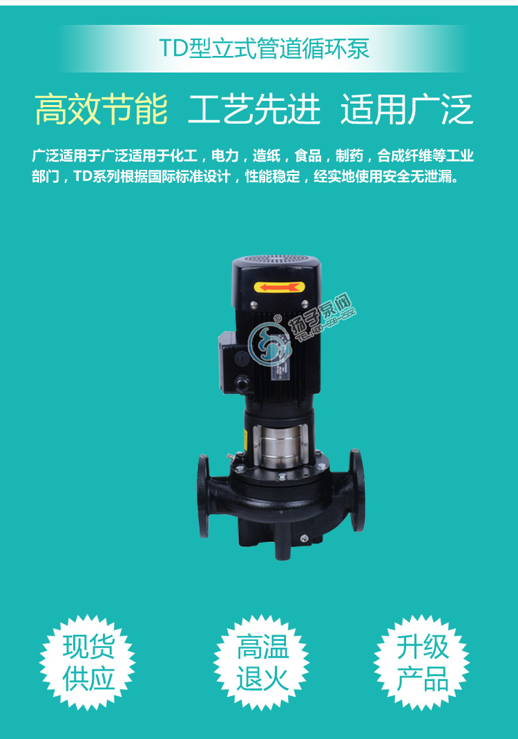 TD型立式管道循環泵,該管道泵進出水口在泵底同一直線上,產品設計為頂部可拉出的拆裝形式,其可以在不影響管路系統的情況下對泵進行維修;運用范圍:主要用于工業方面,例如工業原料的輸送、加熱循環系統、系統增壓、生活熱水循環等領域;該立式管道泵適宜輸送清潔、稀薄、非易燃易爆液體、不含固體顆?;蚶w維,且介質不能對泵材料產生化學腐蝕;性能及優點:結構緊湊、維護方便、噪音低、可選配鑄鐵或不銹鋼葉輪。所有機械密封為便拆式,更換機械密封無需拆卸電機。