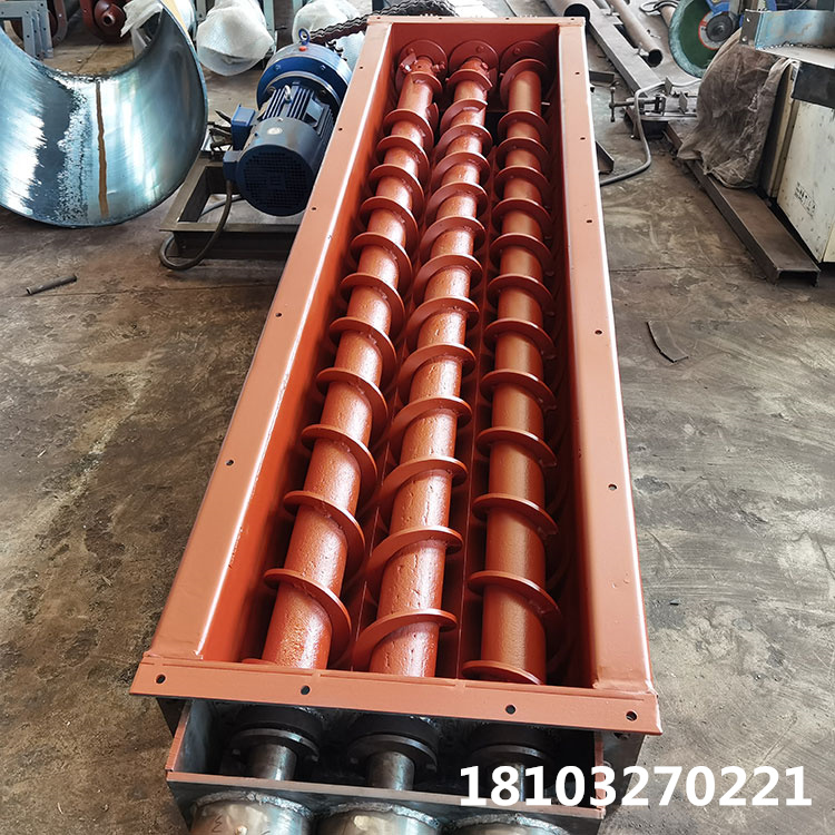 當螺旋軸轉動時,由于物料的重力及其與槽體壁所產生的摩擦力,使物料只能在葉片的推送下沿著輸送機的槽底向前移動,其情況好像不能旋轉的螺母沿著旋轉的螺桿作平移運動一樣 。物料在中間軸承的運移,則是依靠后面前進著的物料的推力。所以,物料在輸送機中的運送,完全是一種滑移運動。為了使螺旋軸處于較為有利的受拉狀態,一般都將驅動裝置和卸料口安放在輸送機的同一端,而把進料口盡量放在另一端的尾部附近。 旋轉的螺旋葉片將物料推移而進行輸送,使物料不與螺旋輸送機葉片一起旋轉的力是物料自身重量和螺旋輸送機機殼對物料的摩擦阻力。葉片的面型根據輸送物料的不同有實體面型、帶式面型、葉片面型等型式。螺旋輸送機的螺旋軸在物料運動方向的終端有止推軸承以隨物料給螺旋的軸向反力,在機長較長時,應加中間吊掛軸承