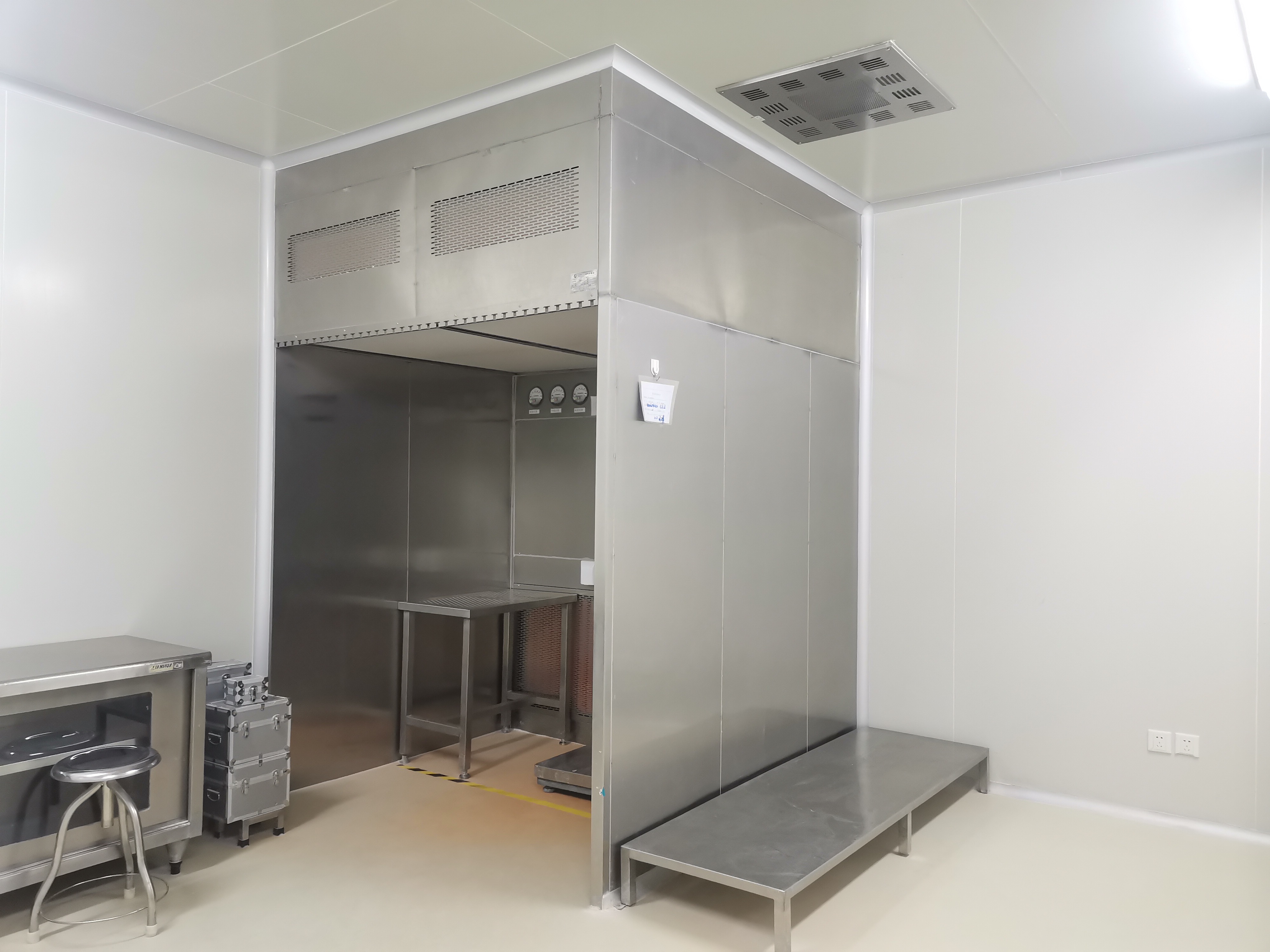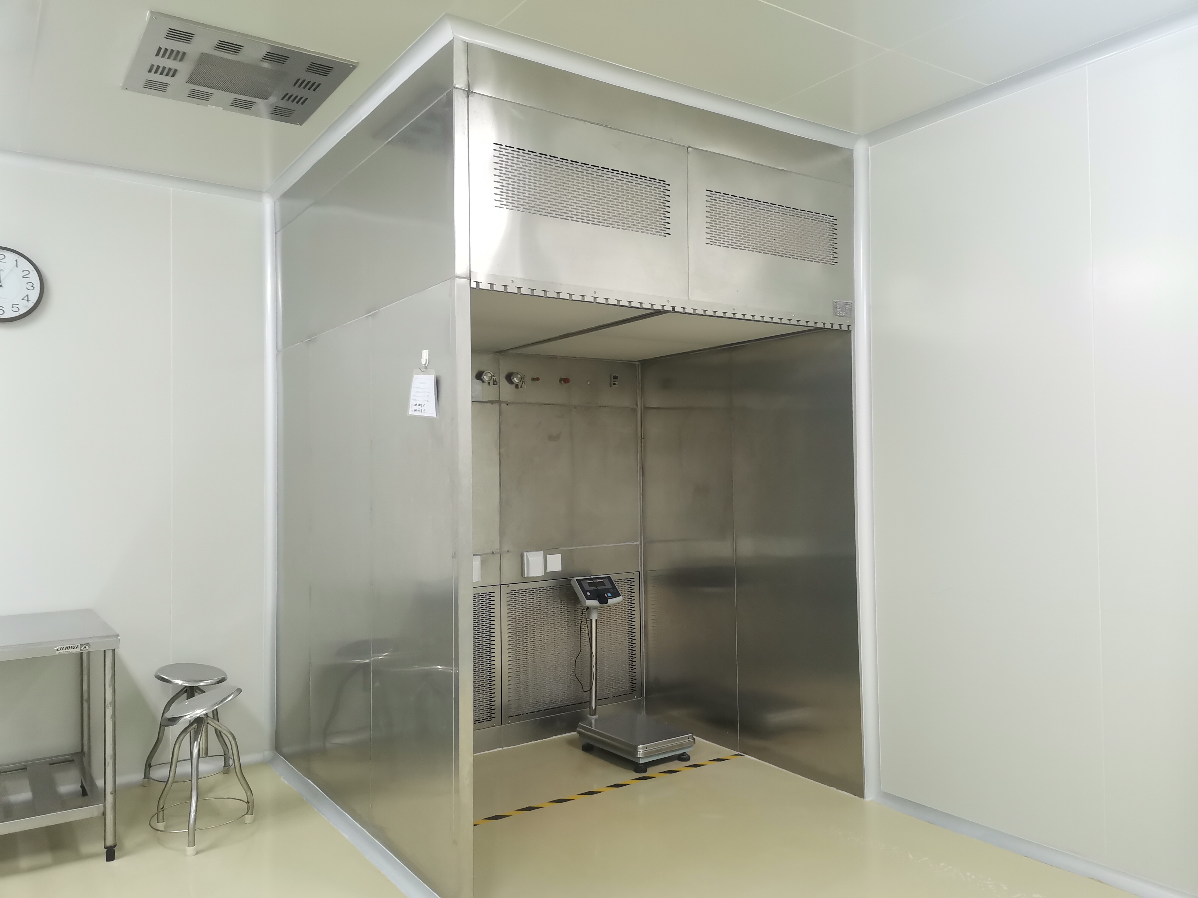負(fù)壓稱量室產(chǎn)品介紹負(fù)壓稱量室(罩)是一種用于制藥、微生物研究和科學(xué)實(shí)驗(yàn)等場所專用的局部凈化設(shè)備,它提供一種垂直單向氣流。部分潔凈空氣在工作區(qū)循環(huán),部分排出至附近區(qū)域,使工作區(qū)產(chǎn)生負(fù)壓。在設(shè)備中進(jìn)行粉塵、試劑稱量、分裝,可以控制粉塵、試劑外溢、上揚(yáng),防止粉塵、試劑對人體的吸入危害,還可避免粉塵、試劑的交叉污染,保護(hù)外界環(huán)境及室內(nèi)人員的安全。2、負(fù)壓稱量室工作原理設(shè)備采用垂直單向流的氣流形式,回風(fēng)先通過初效過濾器進(jìn)行預(yù)過濾,將氣流中的大顆粒粉塵粒子處理掉。經(jīng)過預(yù)處理后的空氣,再經(jīng)過中效過濾器進(jìn)行二次過濾,以起到充分保護(hù)高效過濾器的作用。在離心風(fēng)機(jī)提供的壓力下,通過高效過濾器,使之達(dá)到潔凈要求。操作區(qū)與外部環(huán)境的形成相對負(fù)壓,從而保證此區(qū)域內(nèi)的粉塵不會擴(kuò)散至室外,起到保護(hù)外部環(huán)境的作用。3、此型號稱量室采用袋進(jìn)袋出更換G4初效及F8板式中效的結(jié)構(gòu),操作區(qū)正面回風(fēng),人員站立區(qū)正立面作為人機(jī)界面或按鈕的安裝面。本設(shè)備由工作區(qū)、回風(fēng)箱體、風(fēng)機(jī)箱體、出風(fēng)箱體及外箱體幾大部分拼裝而成??刂泼姘逦挥谠O(shè)備內(nèi)部工作區(qū)正面,控制面板采用輕觸型LED控制面板,可以控制風(fēng)機(jī)起停,調(diào)節(jié)風(fēng)機(jī)工況,調(diào)整工作區(qū)需要的風(fēng)速(當(dāng)設(shè)備安裝使用后,需由專門人員調(diào)節(jié)工況)。在其旁有壓差計(jì),測試過濾器的阻力在送風(fēng)箱體的內(nèi)部還有排風(fēng)調(diào)節(jié)板,可以調(diào)節(jié)設(shè)備的排風(fēng)量在合理的范圍內(nèi)(設(shè)備安裝就位后,由專業(yè)人員設(shè)試,請勿擅自調(diào)整)
