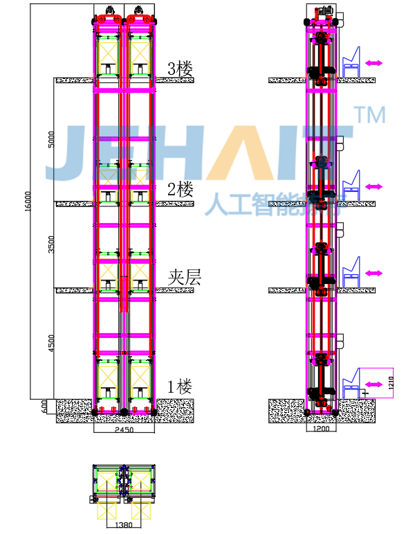 提升機方便樓層與樓層之間的貨物輸送,接駁口可采用,AGV對接,滾筒式或者貨叉式,多種應用。