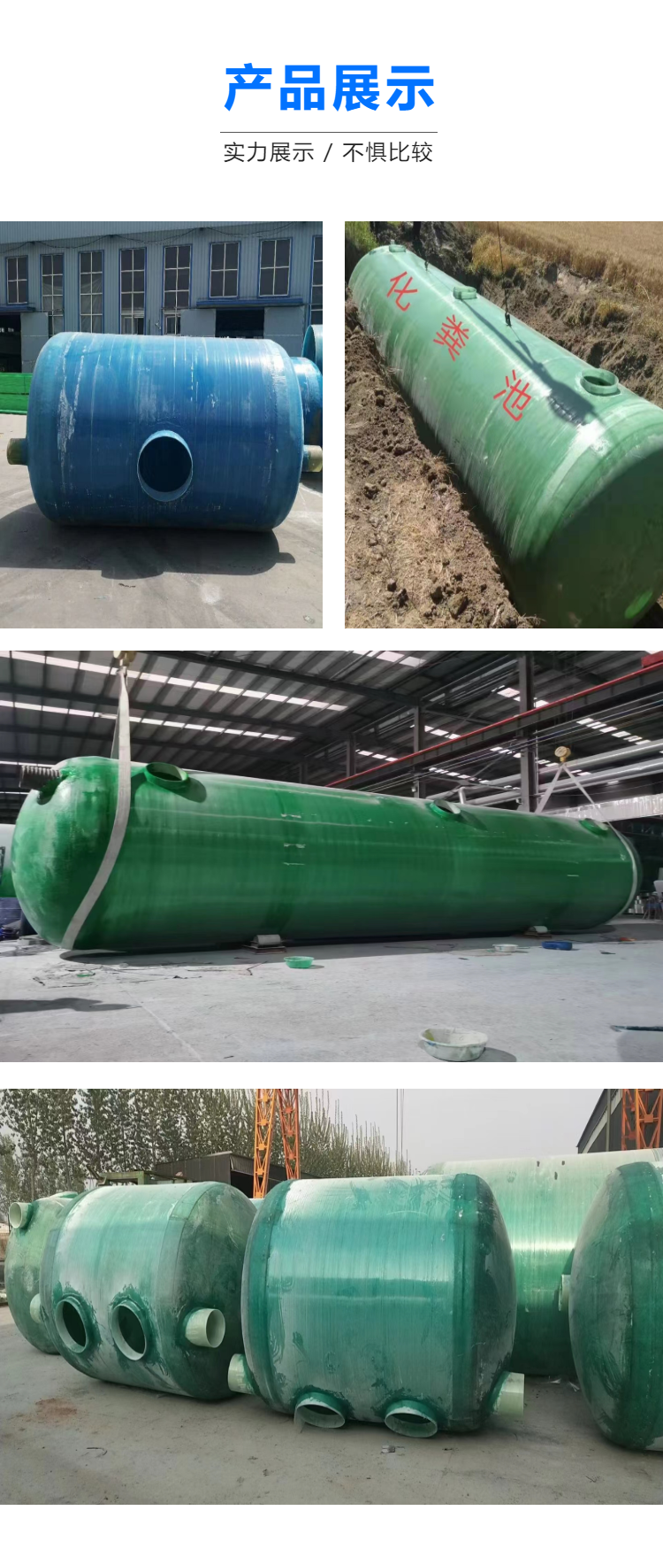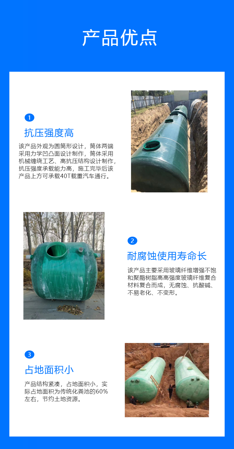 公司主營一體化泵站、儲罐、纏繞化糞池、纏繞管道、夾砂管道、管件、SMC新農村改造化糞池、立篦式雨水口,污水池蓋板、脫硫塔、陽極管等各種玻璃鋼制品。廣泛應用于鄉村建設、市政工程、化工、電力、航天、國防、醫藥等行業。