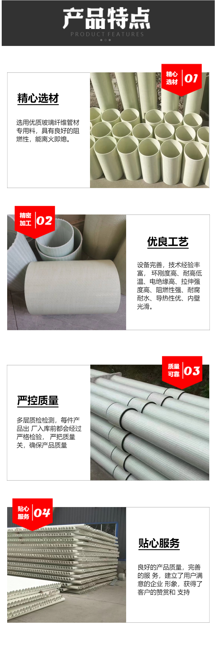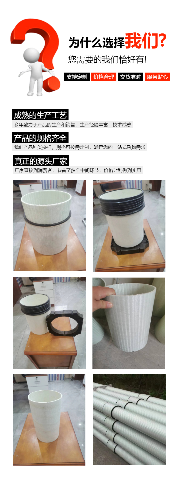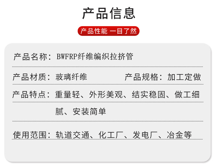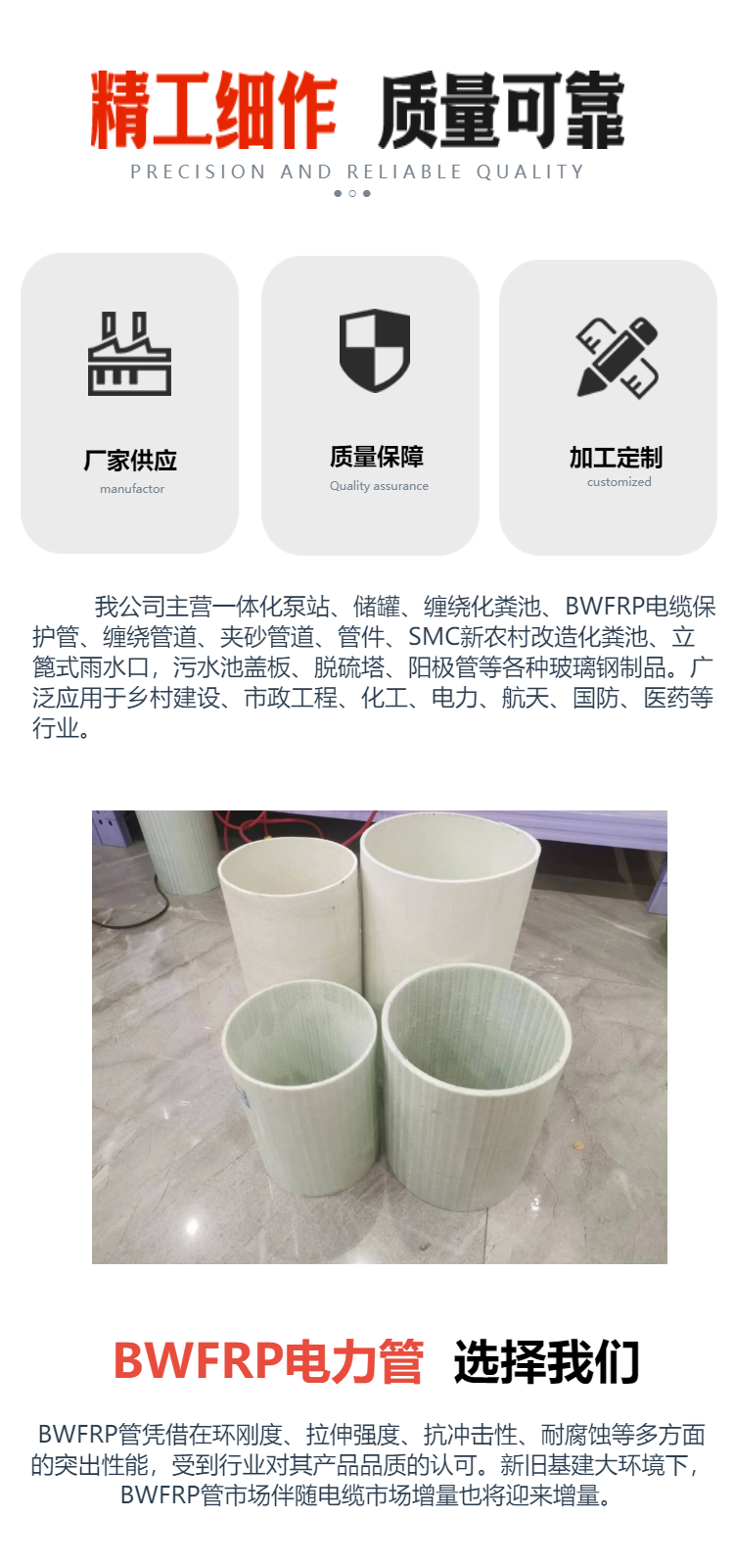 公司主營一體化泵站、儲罐、纏繞化糞池、纏繞管道、夾砂管道、管件、SMC新農村改造化糞池、立篦式雨水口,污水池蓋板、脫硫塔、陽極管等各種玻璃鋼制品。廣泛應用于鄉村建設、市政工程、化工、電力、航天、國防、醫藥等行業。