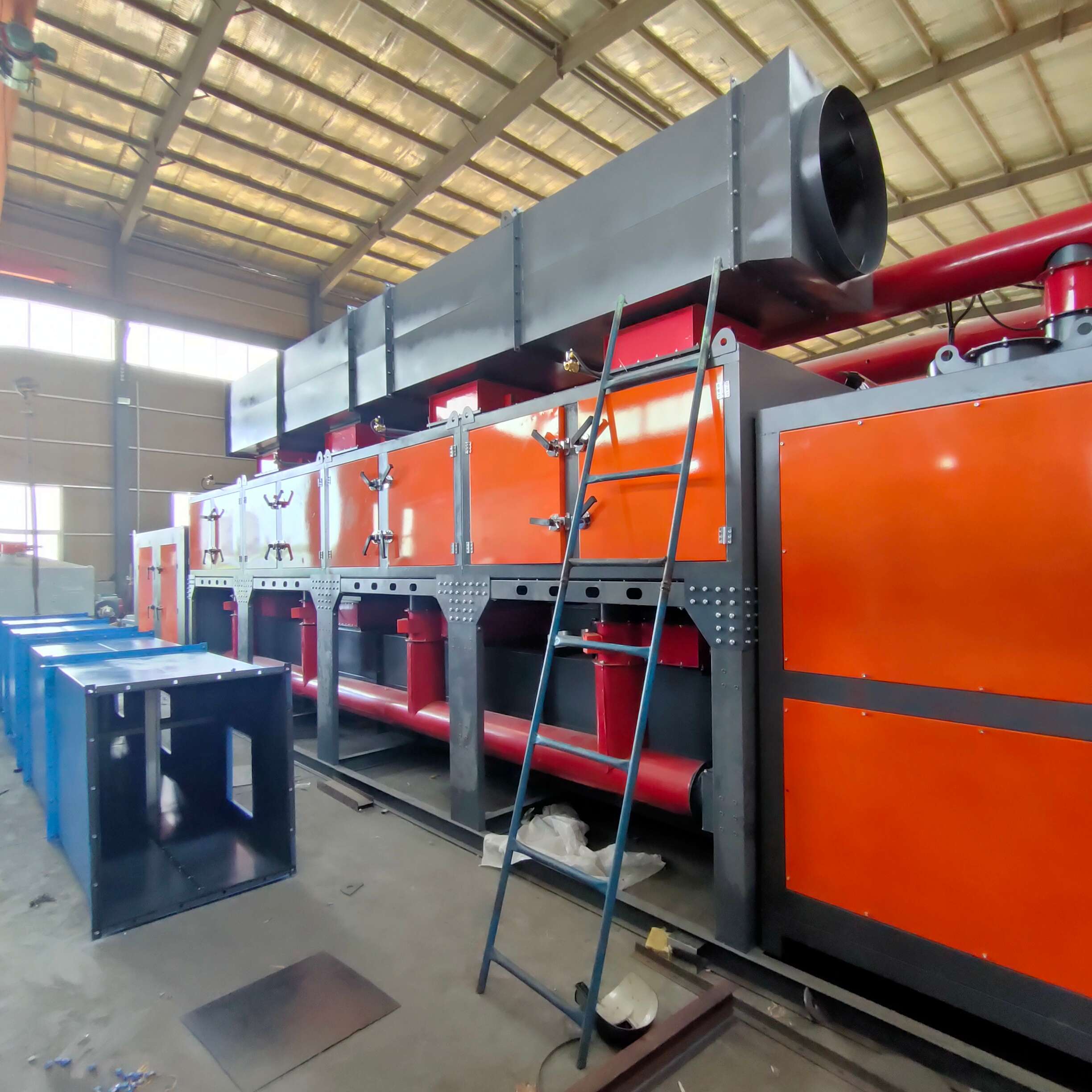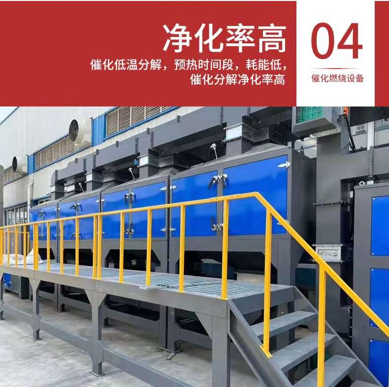 活性炭經過吸附運行一段時間后達到飽和,啟動系統的脫附-催化燃燒過程,通過熱氣流將原來已經吸附在活性炭表面的有機溶劑脫附出來,并經過催化燃燒反應轉化生成CO2和水蒸氣等無害物質,并放出熱量。當催化燃燒反應床加熱到~300℃,活性炭吸附床局部達到 60~150℃時,從吸附床脫附出來的高濃度廢氣就可以在催化反應床中進行氧化還原反應。反應后的高溫氣體經換熱器的換熱,換熱后的氣體一部分回用送入活性炭吸附床進行脫附,另一部分排入大氣。脫附出來的廢氣經換熱器換熱后溫度迅速提高,降低了催化燃燒的啟動電功率,從而使催化燃燒裝置及脫附過程達到小功率運行。當脫附達到一定程度時放熱跟脫附加熱達到平衡,系統在不外加熱量的情況下完成脫附再生過程。