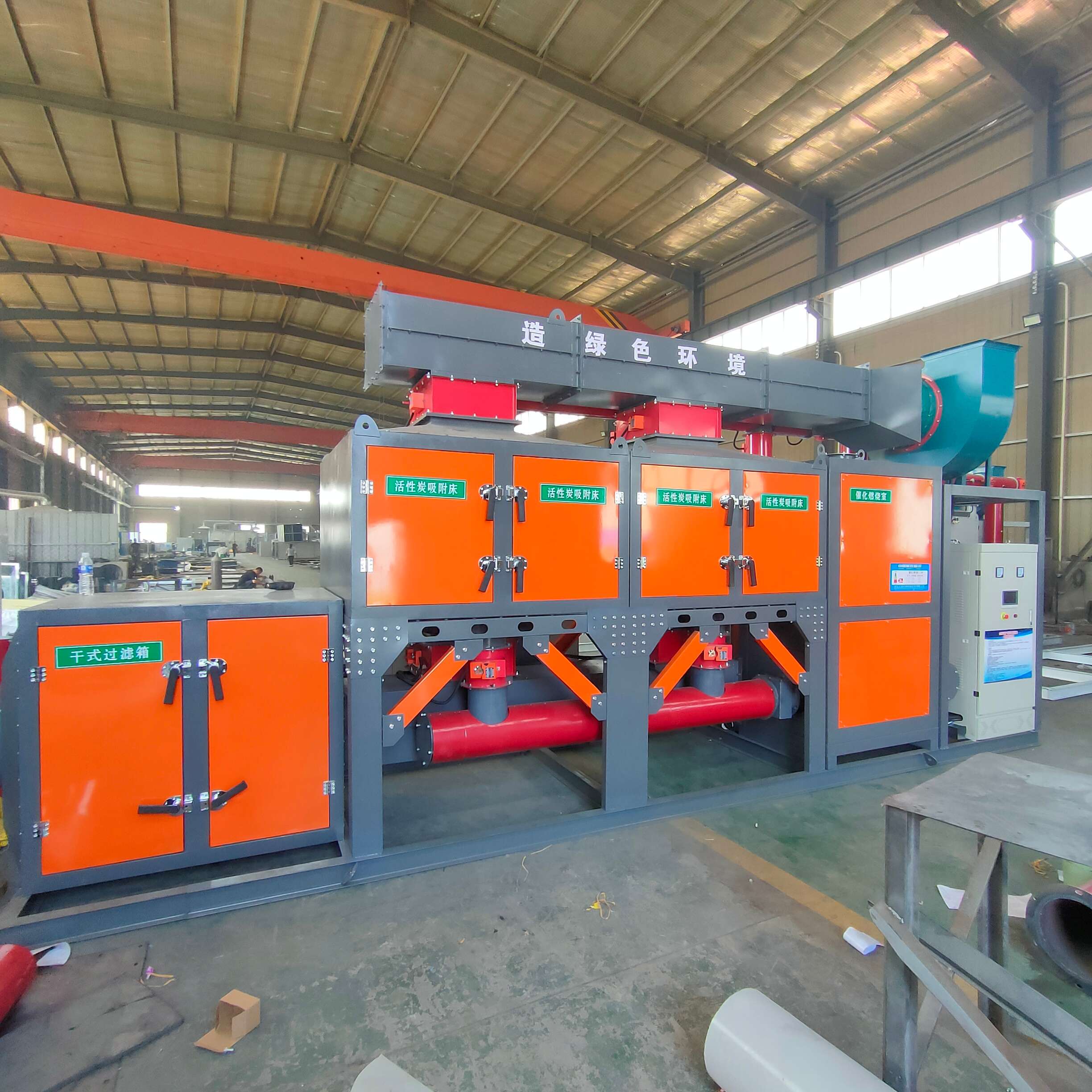 有機廢氣先通過預處理裝置(干式過濾),將廢氣中顆粒狀污染物截留去除,預處理裝置是由G4,F7兩級纖維過濾棉組成,具有可降解、無二次污染及可再生的特點,在過濾中有兩方面的作用,一對顆粒有很好的阻擋過濾效果;二是該材料具有微小孔徑(孔徑在幾十納米),過濾層容塵量大,使用壽命長。