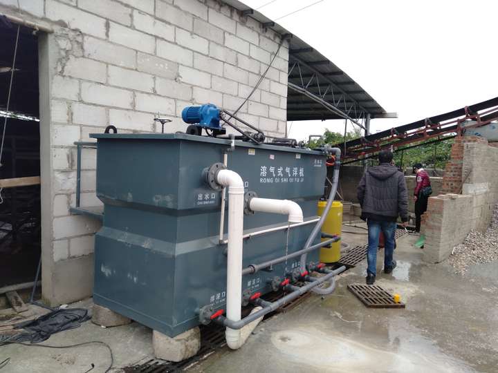 給藥后的污水進入空氣反應后的混合區,與氣體和水接觸后釋放的混合溶液,在微細氣泡粘附的絮狀物,再進入氣浮區。浮絮體在氣浮到表面形成浮渣,下水流到水箱的集熱器,用于溶解-體返回,剩下的水流量通過溢流。將浮池表面上的浮渣積累到一定厚度后,-由污泥池吹入浮選機泡沫刮板排出。