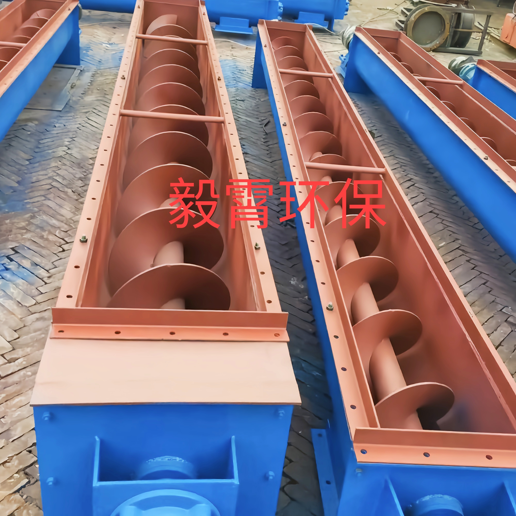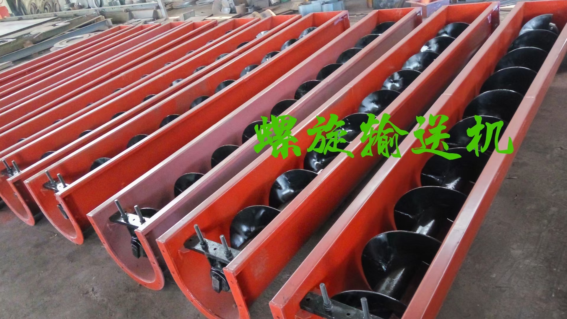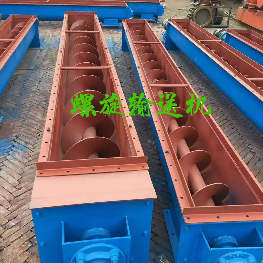 毅霄螺旋絞龍通常由螺旋機本體、進出裝置、驅動裝置三大部分組成。螺旋機本體由頭節、中間節、尾節三種組成。一般情況下,出廠總裝時將中間節按長度長短依次排列,最長的中間節靠近頭節,相同 長度的中間節則挨在一起,如果有特殊要求,則在訂貨時給出排列順序。在頭節內裝有支推軸承承受軸向力,在中間節和尾節內裝有用軸承支承螺旋軸,此外,在尾節內還裝有可軸向移動的徑向軸承以補 償螺旋軸長度的誤差和適應溫度的變化。螺旋面的形式有實體螺旋(S制法)和帶式螺旋(D制法)兩種。各螺旋軸之間采用法蘭式聯接,保證了聯接軸的互換性,便于維修。機蓋為瓦片式并用蓋扣夾緊在機殼上,若需改進密封性能,用戶可自行在機蓋與機殼間加防水粗帆布。進、出料裝置有進料口,方型出料口,手推式出料口,齒條式出料口四種。由用戶在使用現場在機體上開口焊接。布置進、出料口 位置時應注意保證料口至端部的距離,同時避免料口與吊軸承加油杯、機殼聯接法蘭、底座等相碰。