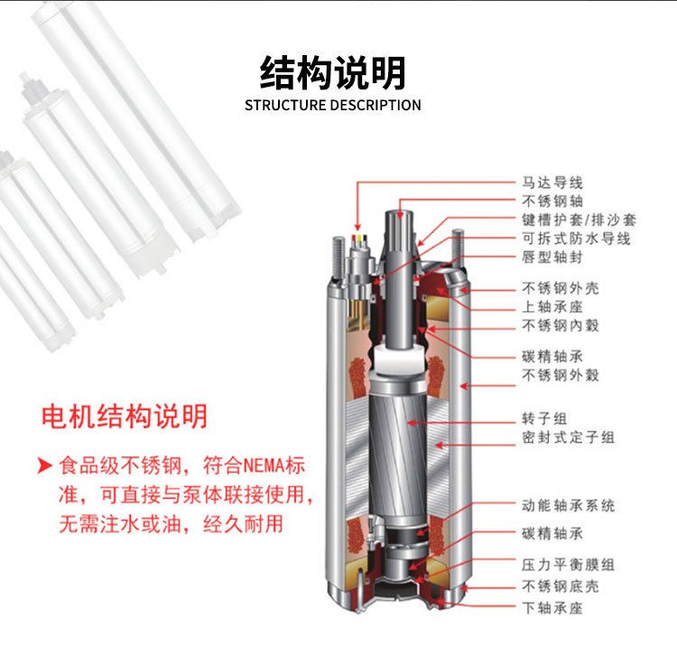 本公司不銹鋼潛水泵葉輪可選用鑄鐵 HT200 ,或耐腐蝕的不銹鋼 304、316、316L,甚至錫青銅材質,適配不同水質與工況。泵殼同樣有鑄鐵 HT200 和不銹鋼可選,堅固耐用。泵軸采用雙相不銹鋼 2205 ,或經1050℃調質處理、加強扭矩的不銹鋼 2GR13 ,保障傳動穩定性。密封采用橡膠密封 O形環與機器密封,有效防漏。適用于農田灌溉、工業取水、礦用搶險、城市供水、電廠冷卻水提取、鋼廠及井用等場景,為各類工程提供可靠的抽水解決方案。