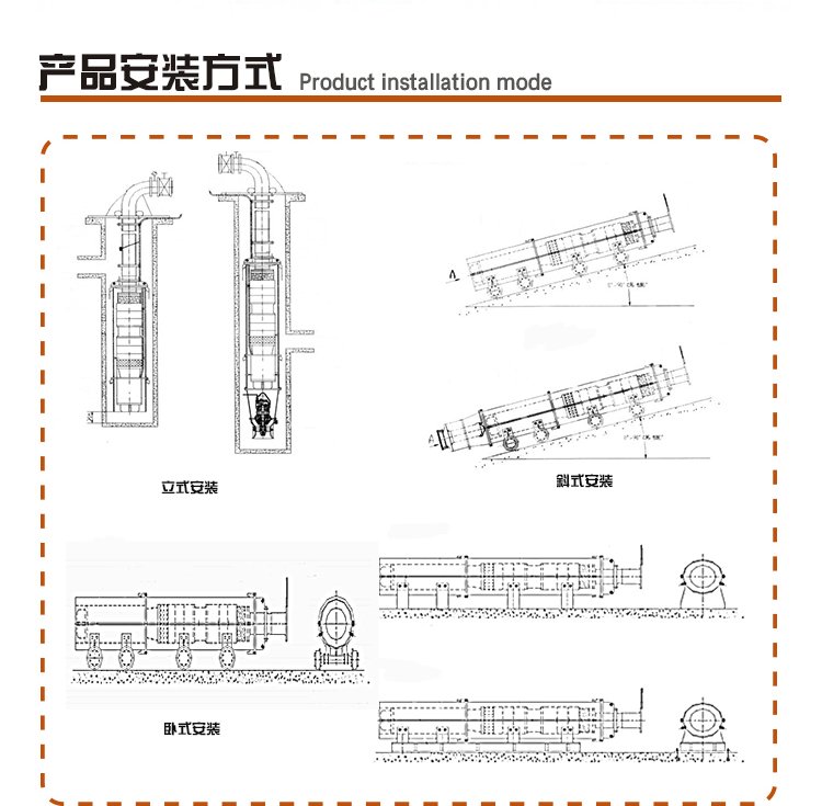斜式安裝(特定需求): 針對傾斜巷道(如采區斜坡道)或受限空間量身定制。泵體按巷道傾角(通常5°-45°)斜置,兼顧一定揚程與流量,解決立式無法垂直、臥式空間不足的特殊場景,實現高效抽排。