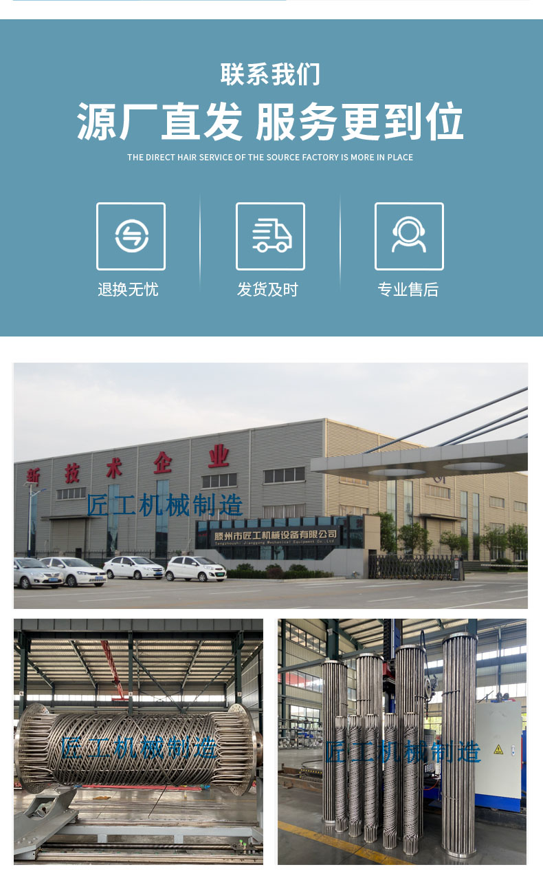 螺旋纏繞管結構型式,換熱管長度是殼體長度的3-6倍,一般我們換熱管長2~4米左右,使物料在換熱管內停留時間更長且換熱更充分,而且我們充分的利用有限元原理,我們換熱器管多管細,把物料單元化使物料增大了和管壁的接觸面積,使物料在出口溫度降的更低,提高了回收率。15589222563