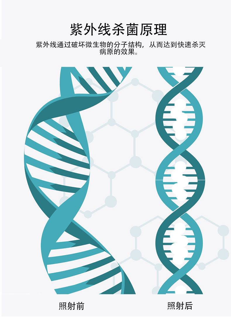 紫外線的殺菌原理:即破壞細菌、病毒的DNA等遺傳物質,改變細胞的遺傳轉錄特性,使生物體喪失蛋白質的合成和復制繁殖能力。