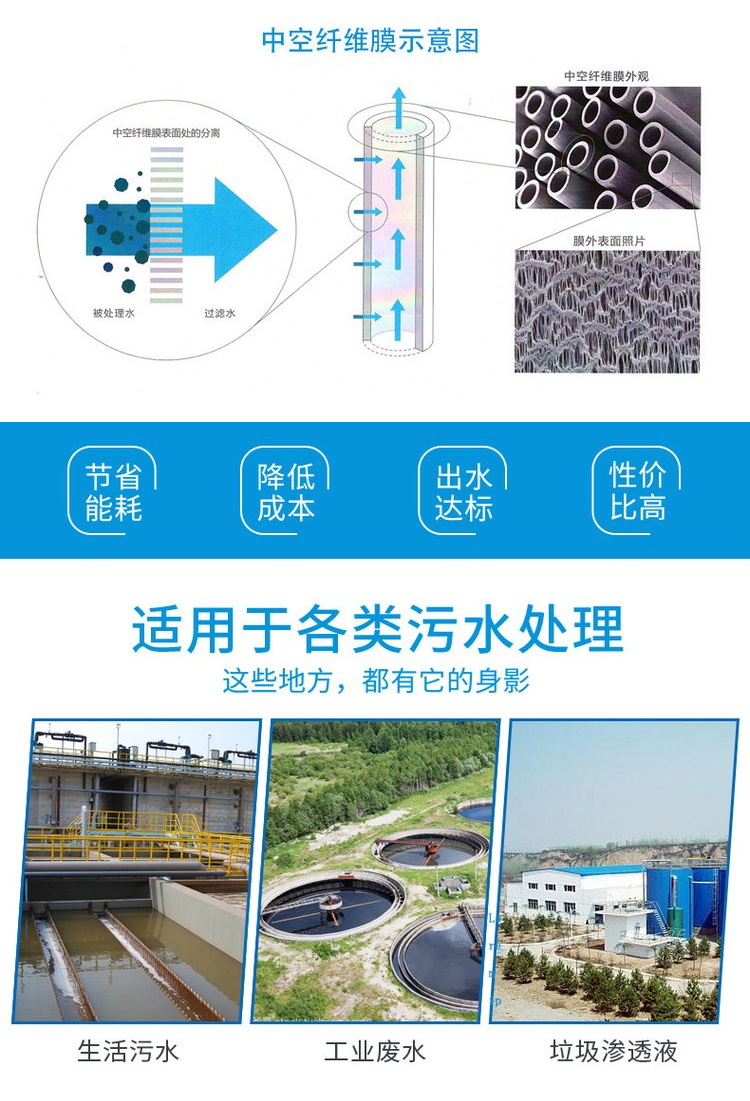 污水處理提標改造升級,鄉鎮污水處理,河道污水處理、工業污水處理、生活小區污水處理,中水回用等選用碧水源MBR膜,抗污染性強、容易清洗恢復,膜絲不易斷裂,使用壽命長5年以上,配套mbr膜PVDF材質簾式膜組件占地面積小,節省空間,適合大中小型污水處理領域。