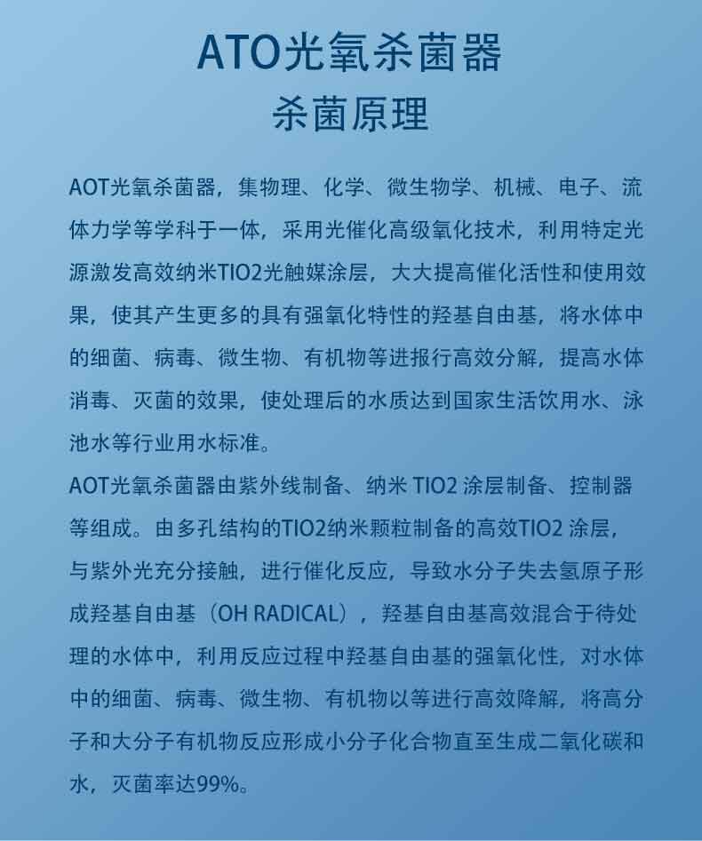 AOT光催化水體滅菌技術,主要利用氧化技術中產生的強氧化性的羥基自由基(HydroxylRadical,·OH),將水中絕大部分的污染物和微生物,降解為 C02、H20和無機鹽,并且不會產生二次污染,是一種綠色,安全的氧化技術。在類似于飲用水這種對處理工藝和安全性要求比較高的領域中有著廣闊的應用前景。
