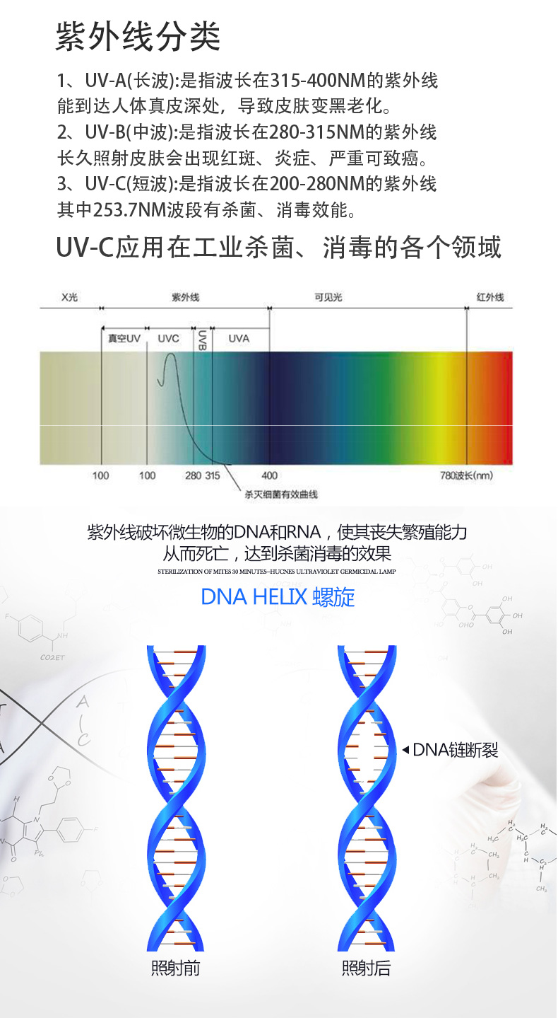紫外線消毒器用途廣泛,在水處理中具有很高的價值觀,它是通過紫外光線的照射,破壞及改變微生物的DNA(脫氧核糖核酸)結構,使細菌當即死亡或不能繁殖后代,達到殺菌的目的。真正具有殺菌作用的是UVC紫外線,因為C波段紫外線很易被生物體的DNA吸收,尤以253.7nm左右的紫外線最佳。紫外線消毒器屬于純物理消毒方法,具有簡單便捷、廣譜高效、無二次污染、便于管理和實現自動化等優點,隨著各種新型設計的紫外線燈管的推出,紫外線殺菌的應用范圍也不斷在擴大。