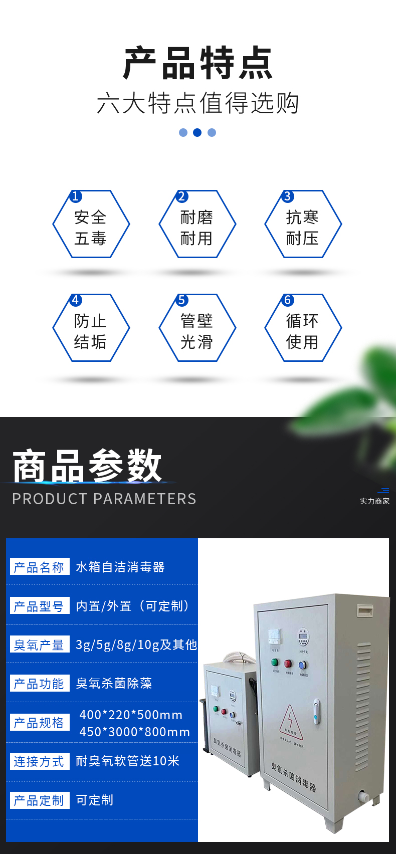 水箱消毒器是我公司根據目前水池(水箱)水質長期滯存,經常遭受病菌、微生物侵襲、污染嚴重的現狀,而開發研制的高新產品。內置式水箱自潔消毒器把臭氧制取技術、高氧化技術、自動控制、射流、罐、臭氧混合泵、壓差混合多重技術融為一體,具有造價低、性價比高、安全衛生、方便快捷、效果顯著、經濟使用等特點。