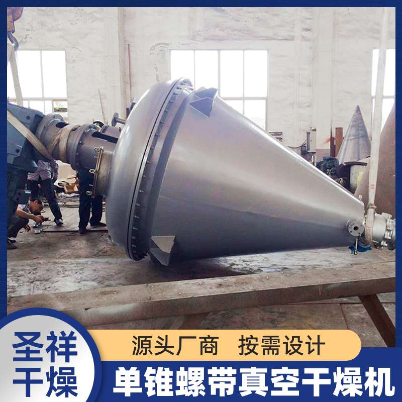 1、單錐干燥機工作過程為間歇批操作,濕物料進入料倉后,通過筒壁夾套和螺旋槳內部給熱,使給熱面積達到整個容器面積的120%,對物料進行升溫干燥。并選擇相應的錐型干燥混合器型號(工作容積)達到理想的干燥效果。采用上驅式結構的混合干燥機具有高效干燥、混合能力的同時,具有空間充裕,更便于使用者進行檢修維護的特點。