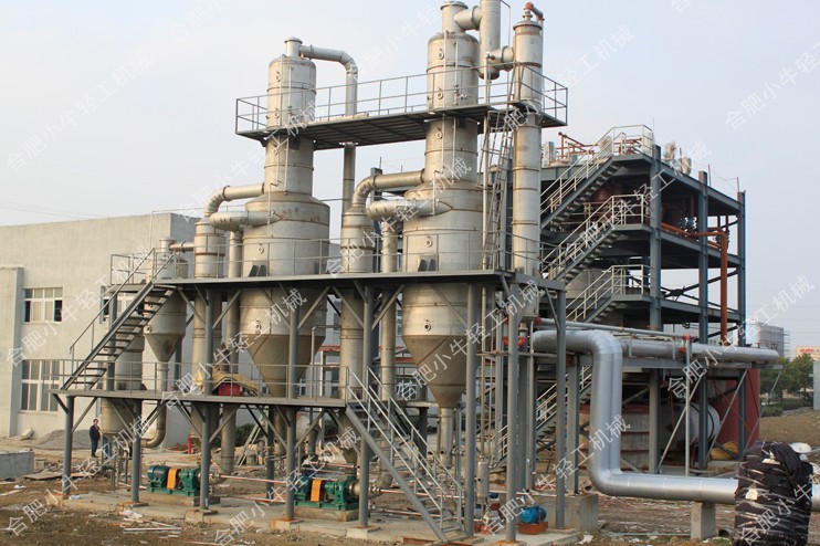 設備主要由各效蒸發(fā)器、各效分離器、冷凝器、循環(huán)泵、效間泵、真空及排水系統(tǒng)、操作平臺、電器儀表控制柜及閥門、管路等系統(tǒng)組成。