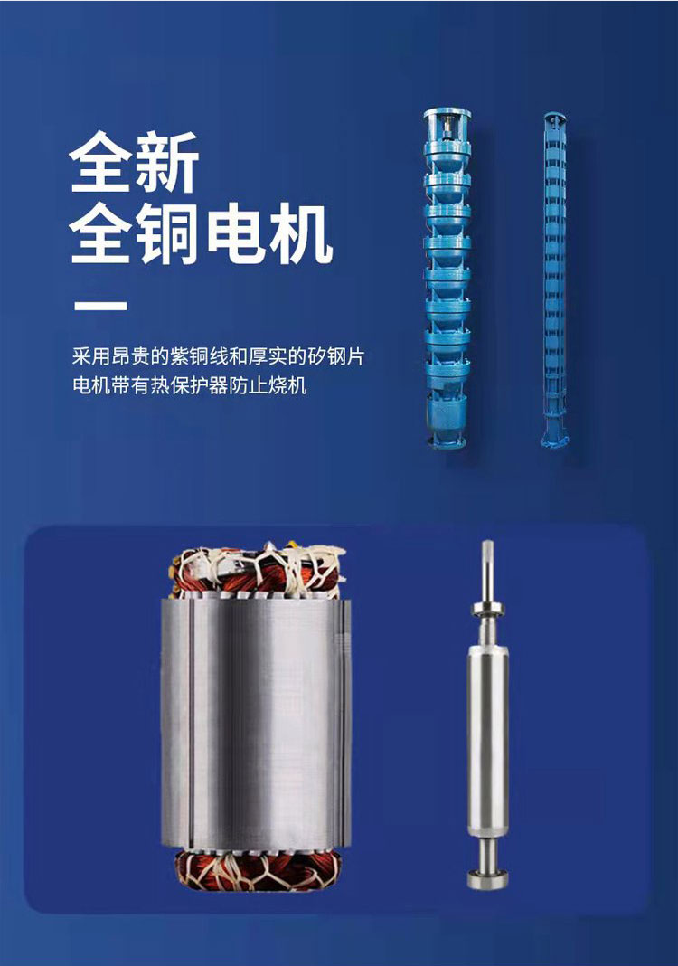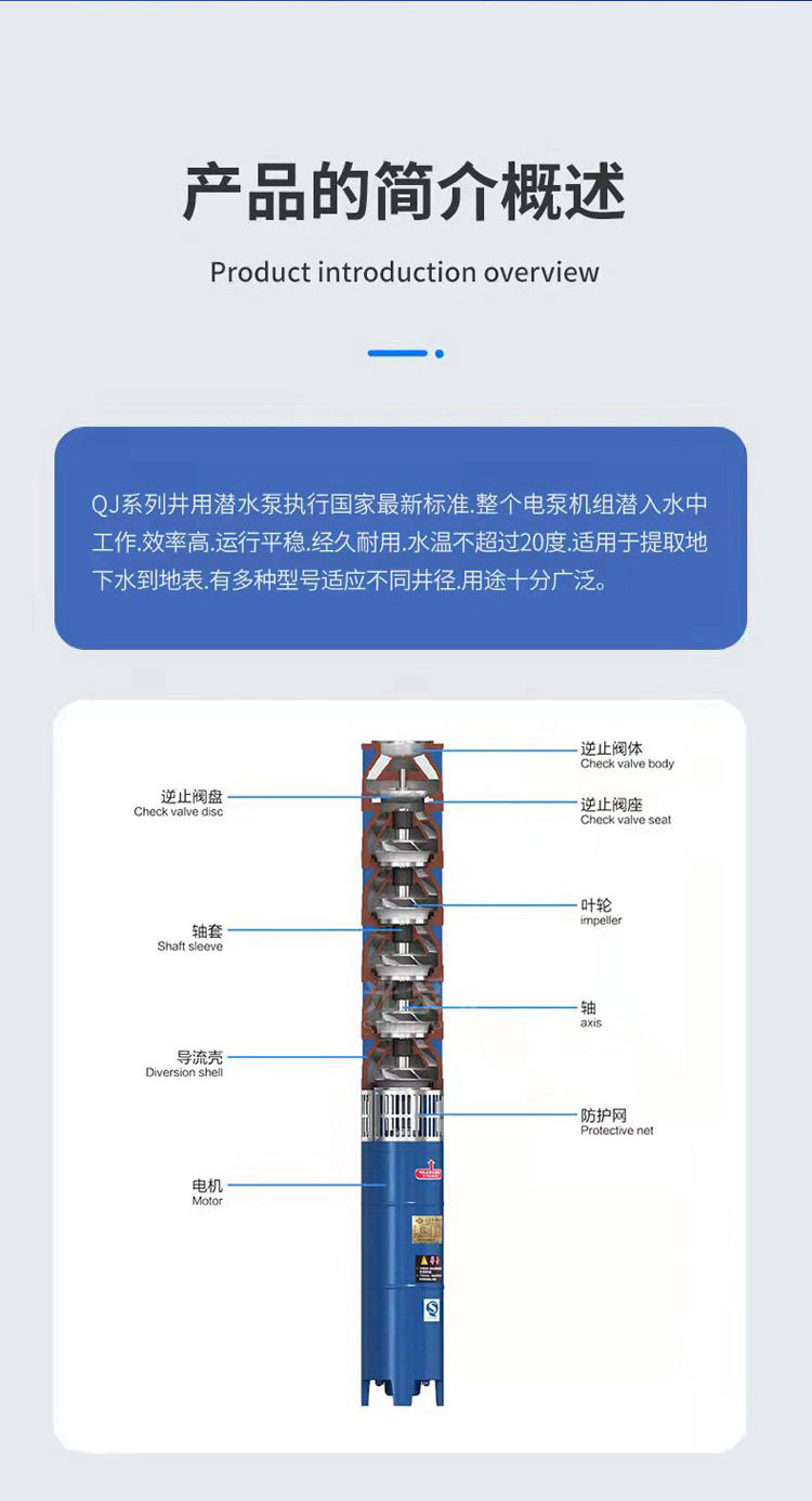 一、 產品概述 QJ系列潛水泵是一種立式、多級、離心式潛水泵。它與潛水電機直接耦合,組成一個整體,完全潛入水下工作。其核心設計目的是為了從幾十米到數百米深的地下水中高效、穩定地提水。 主要特點: 高效節能: 多級葉輪設計,提供高揚程的同時保持較高效率。 結構緊湊: 泵與電機一體,占地面積小,無需地面泵房。 安裝維護簡便: 通過電纜和輸水管吊裝到井下,維護時整體提出即可。 運行穩定、壽命長: 水下運行噪音低、無汽蝕問題,設計壽命長。 適用性強: 可通過選用不同材質和配置,適應多種水質。 二、 主要結構與工作原理 泵體部分: 由進水段、多級導流殼/中段(內含葉輪)、出水段組成。每一級葉輪都能增加一定的壓力和速度,級數越多,總揚程越高。 潛水電機部分: 位于水泵下方,為專用的充水式密封潛水三相異步電動機。電機內腔充滿純凈的冷卻水/潤滑劑,用于絕緣、冷卻和潤滑軸承。 密封系統: 這是潛水泵的關鍵,通常包括機械密封(或油封)組,嚴格防止水進入電機內部,確保電機安全。 保護系統: 泵會配備過熱、過載、漏水、缺相等保護傳感器,集成于電機或控制柜中。 附屬部件: 包括潛水電纜、揚水管(鋼管或PVC管)、吊裝索和控制柜。 工作原理: 通電后,潛水電機帶動軸上的多級葉輪高速旋轉。水從泵底部的濾網進入,經每一級葉輪逐級加壓,動能和壓能不斷增加,從泵頂部的出口流出,通過揚水管輸送到地面。