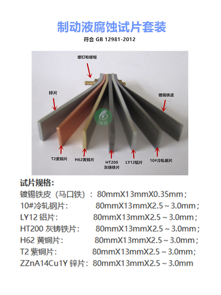 制動(dòng)液腐蝕試片是用來(lái)評(píng)定制動(dòng)液對(duì)金屬的腐蝕性。符合GB 12981-2012《機(jī)動(dòng)車(chē)輛制動(dòng)液》附錄F中制動(dòng)液金屬疊片腐蝕檢驗(yàn)法的技術(shù)要求,標(biāo)準(zhǔn)中規(guī)定七種典型金屬試片,分別為:鍍錫鐵皮(馬口鐵)、10#冷軋鋼片、LY12鋁片、HT200灰鑄鐵片、H62黃銅片、T2紫銅片、ZZnA14Cu1Y鋅片。