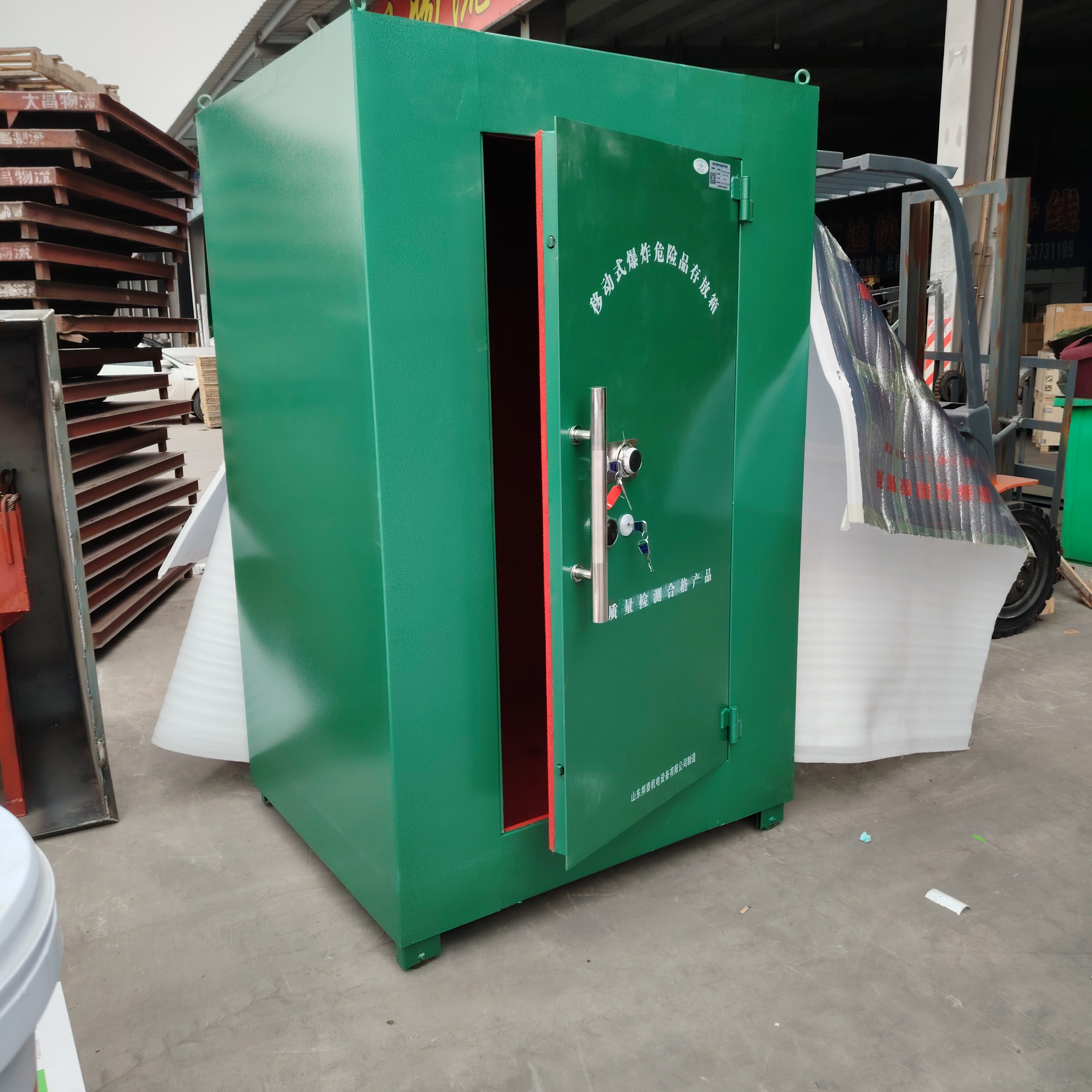 結構和材質:火工品存放柜通常由防b鋼板制成,這種材料具有較高的強度和防b性能,能夠抵抗外部沖擊和破壞。