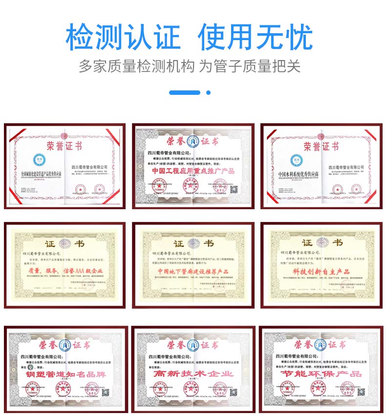 四川蜀帝管業有限公司是成都專業生產銷售涂塑鋼管廠家;我們主要生產涂塑鋼管、防腐鋼管、PSP鋼塑復合管、襯塑鋼管、穿線管、外鍍鋅內涂塑鋼管、內襯不銹鋼外涂塑鋼管等鋼塑復合管材。產品防腐耐磨,使用壽命久,主要應用在市政、建筑、工業等給排水領域。