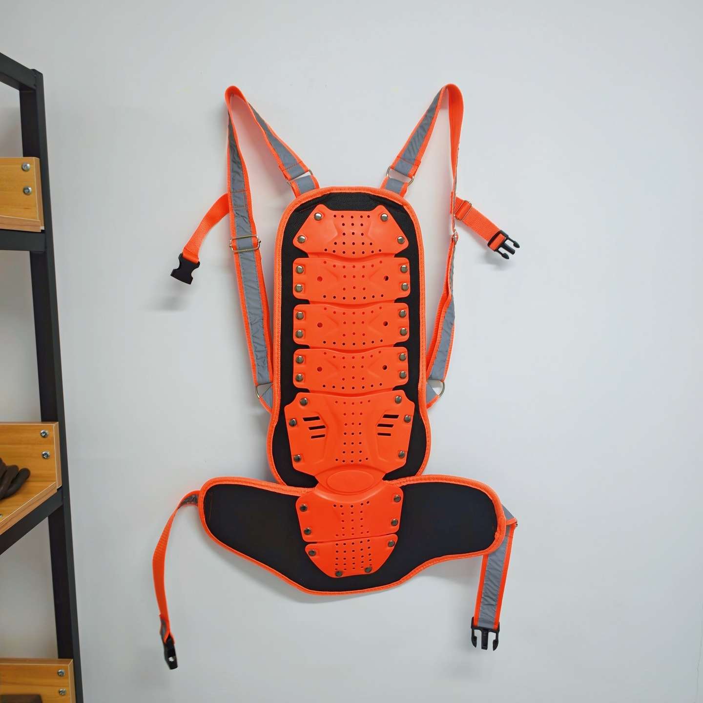 結構組成:通常由背帶、護板、緩沖襯墊和連接件等組成。護板是外層防護核心,能擋住大部分沖擊力,緩沖襯墊則可吸收剩余力道,保護脊柱和內臟。