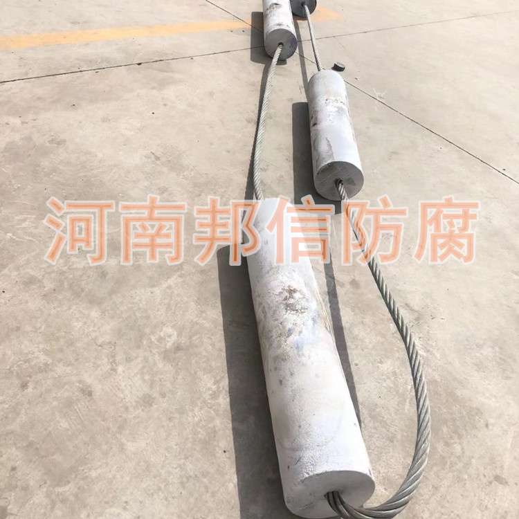 結(jié)構(gòu)組成:串狀鎂合金犧牲陽(yáng)極由多個(gè)鎂合金陽(yáng)極塊組成,陽(yáng)極塊之間依次用等長(zhǎng)的扁鋼焊接成串狀。在各鎂合金陽(yáng)極塊的背面通常有 1-5 道環(huán)氧瀝青漆層,使電流分布更均勻。