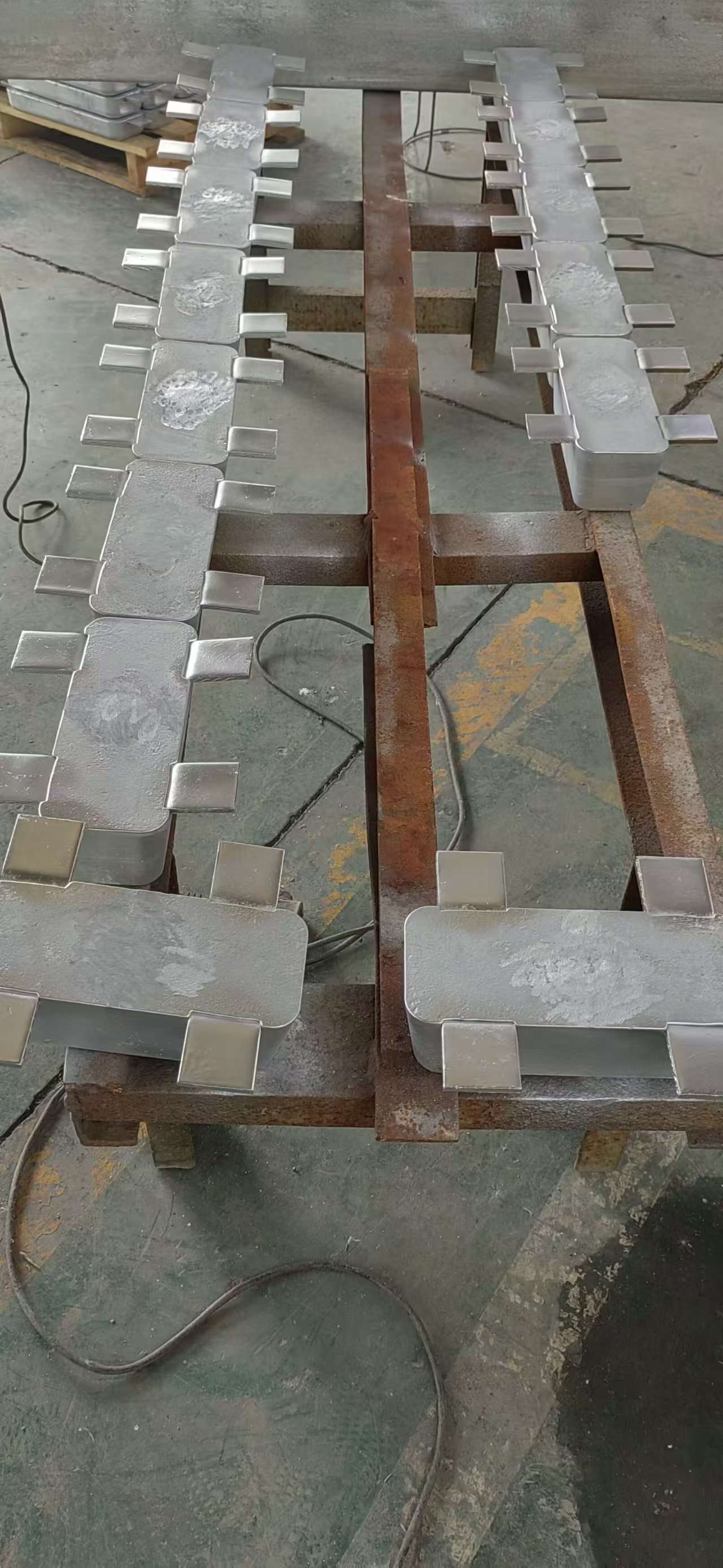2. 陽極預(yù)處理:檢查陽極表面是否存在破損、氧化層,若有氧化層,需用砂紙打磨至露出金屬光澤,確保陽極能夠正常放電;對于塊狀、棒狀陽極,需在陽極頂部焊接導(dǎo)線(采用銅芯導(dǎo)線,截面積≥10mm2),焊接處需進(jìn)行防腐處理(涂刷防腐涂料),避免焊接處腐蝕導(dǎo)致回路斷開。