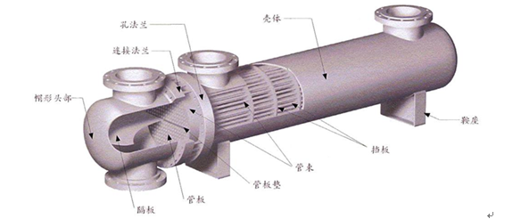 管殼式換熱器由殼體、傳熱管束、管板、折流板(擋板)和管箱等部件組成。殼體多為圓筒形,內(nèi)部裝有管束,管束兩端固定在管板上。進(jìn)行換熱的冷熱兩種流體,一種在管內(nèi)流動(dòng),稱為管程流體;另一種在管外流動(dòng),稱為殼程流體。為提高管外流體的傳熱分系數(shù),通常在殼體內(nèi)安裝若干擋板。擋板可提高殼程流體速度,迫使流體按規(guī)定路程多次橫向通過管束,增強(qiáng)流體湍流程度。換熱管在管板上可按等邊三角形或正方形排列。等邊三角形排列較緊湊,管外流體湍動(dòng)程度高,傳熱分系數(shù)大;正方形排列,則管外清洗方便,適用于易結(jié)垢的流體。
