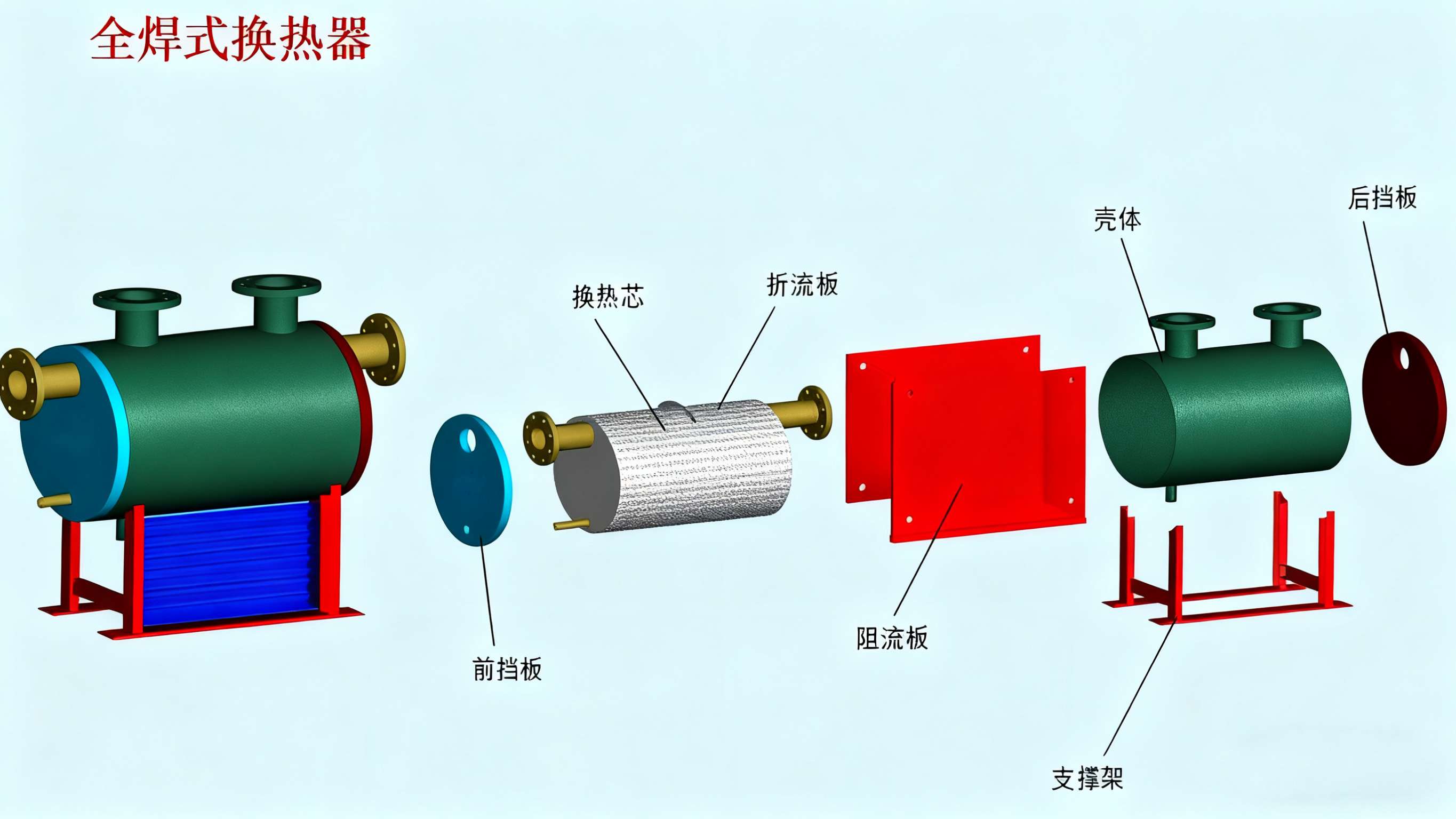 全焊式板殼式換熱器是結合板式換熱器高效緊湊與管殼式換熱器耐壓耐溫優(yōu)勢的新型換熱設備,核心結構為波紋板片組焊接成板束(替代管殼式的管束),外側加裝殼體,板片間形成復雜流道,冷熱介質在板束兩側逆流換熱,無墊片密封,全焊接結構大幅提升了耐壓、耐溫及抗腐蝕性能。