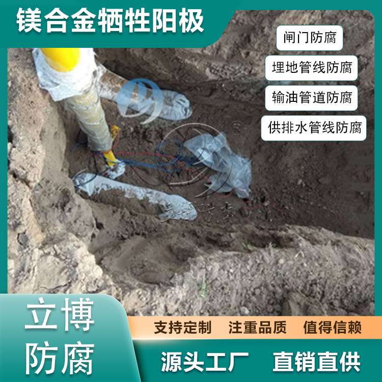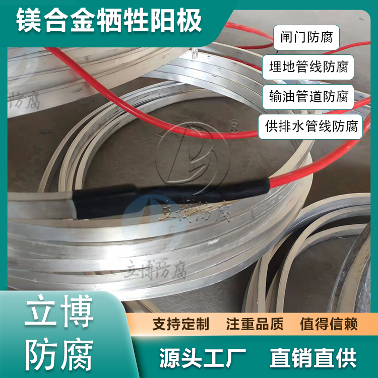 鎂合金犧牲陽極適用于地下及淡水中的輸油、輸氣、供排水管線、地下電纜、化工、通訊、港灣、船舶、水庫閘門等工程的防腐保護(hù)
