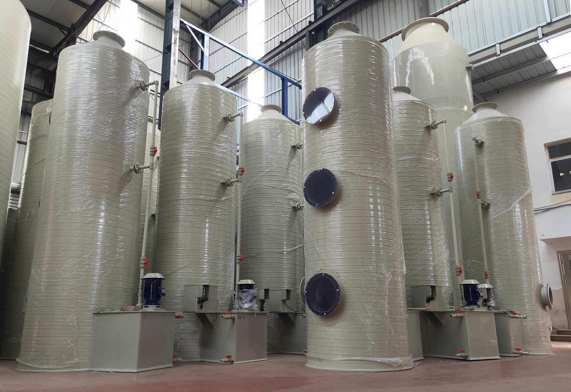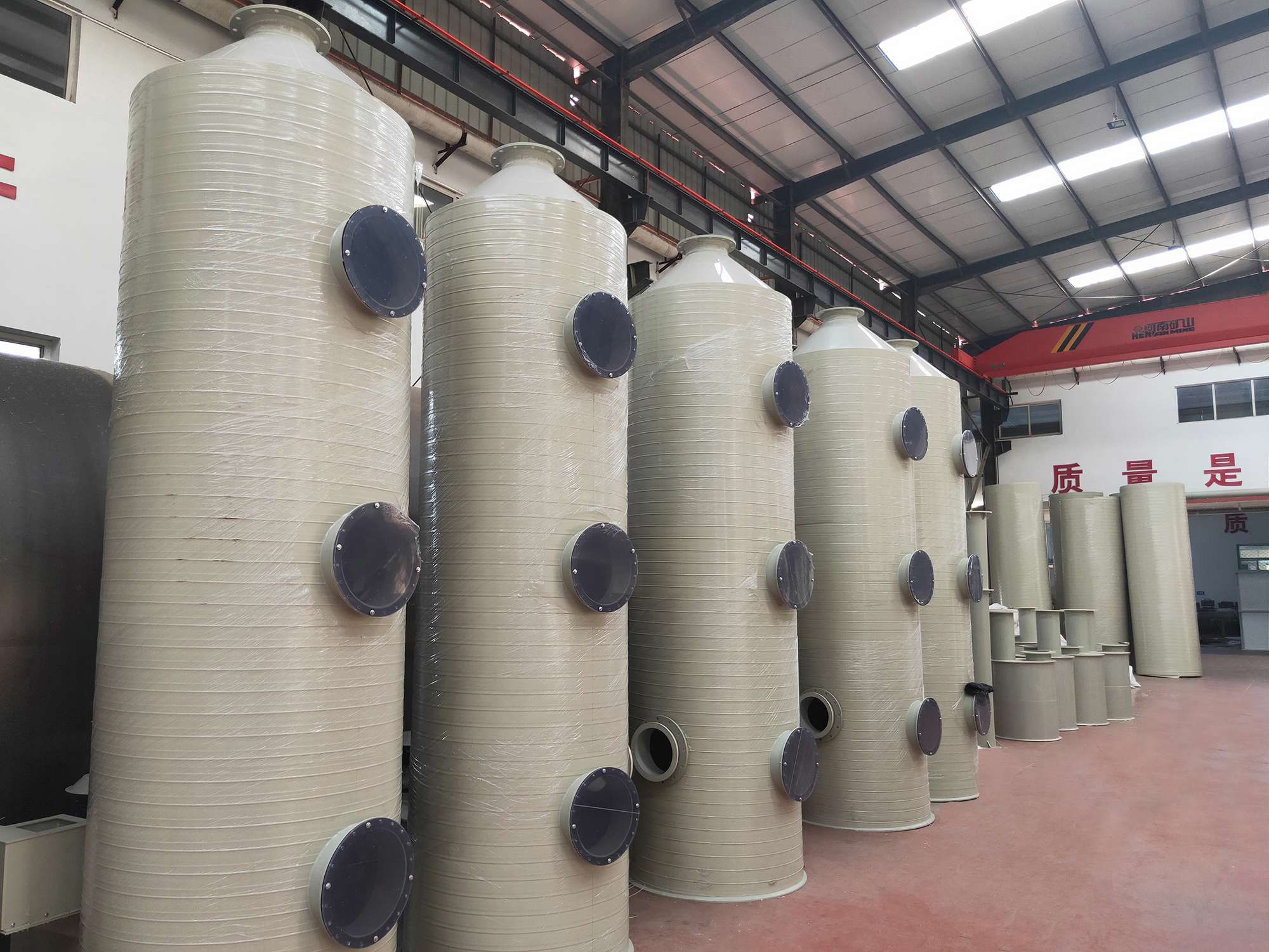 河北恒力達防腐橡塑管業有限公司專業生產PP聚丙烯噴淋塔,規格直徑600MM-30000MM模具齊全,是凈化鹽酸、硫酸霧及氮氧化物廢氣的新型凈化設備,玻璃鋼噴淋塔具有凈化效率高,結構緊湊,占地面積小,耐腐蝕、耐老化性能好,重量輕,便于安裝、運輸,管理、維修等特點。天宏風機生產的玻璃鋼噴淋塔采用組合式模具,可以到現場組裝。 噴淋吸收工業廢氣處理設備對酸霧、堿霧和油漆霧的吸收、吸附、氧化、中和有特殊功效