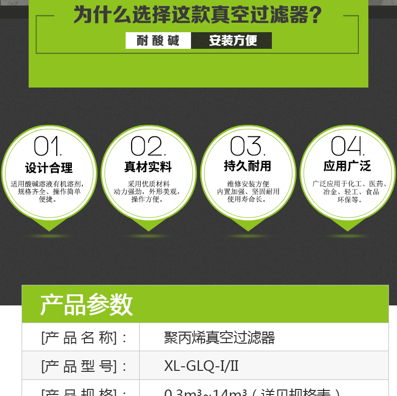 我公司生產(chǎn)的聚丙烯過濾器是一種無毒、無味的高結(jié)晶塑料過濾器,常用于生產(chǎn)中的物料過濾、固體分離等。真空過濾器分為封頭式、平底式兩種。主要用于化工、醫(yī)藥、石油等行業(yè)生產(chǎn)過程中,具有重量輕、安裝維修方便、操作簡單等優(yōu)點(diǎn)。